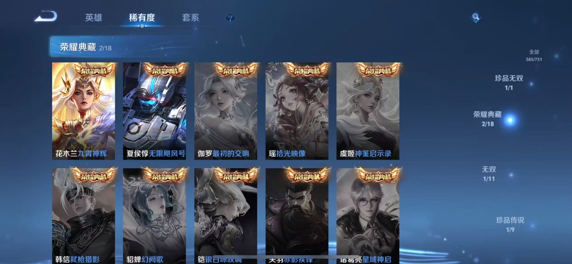 大乔白鹤梁神女,黄忠烈魂,甄姬幽恒,伽罗太华,典韦岱宗,露娜启示之音,后羿辉光之辰,庄周玄嵩,公孙离玉兔公主,裴擒虎李小龙,裴擒虎天狼狩猎者,上官婉儿梁祝,花木兰默契交锋,马可波罗深海之息,猪八戒猪悟能,女娲愿照·千秋盛,芈月白晶晶,百里玄策白虎志,马超神威,妲己时之彼端,韩信飞衡,澜愿照·九州拓,王昭君凤凰于飞,关羽冰锋战神