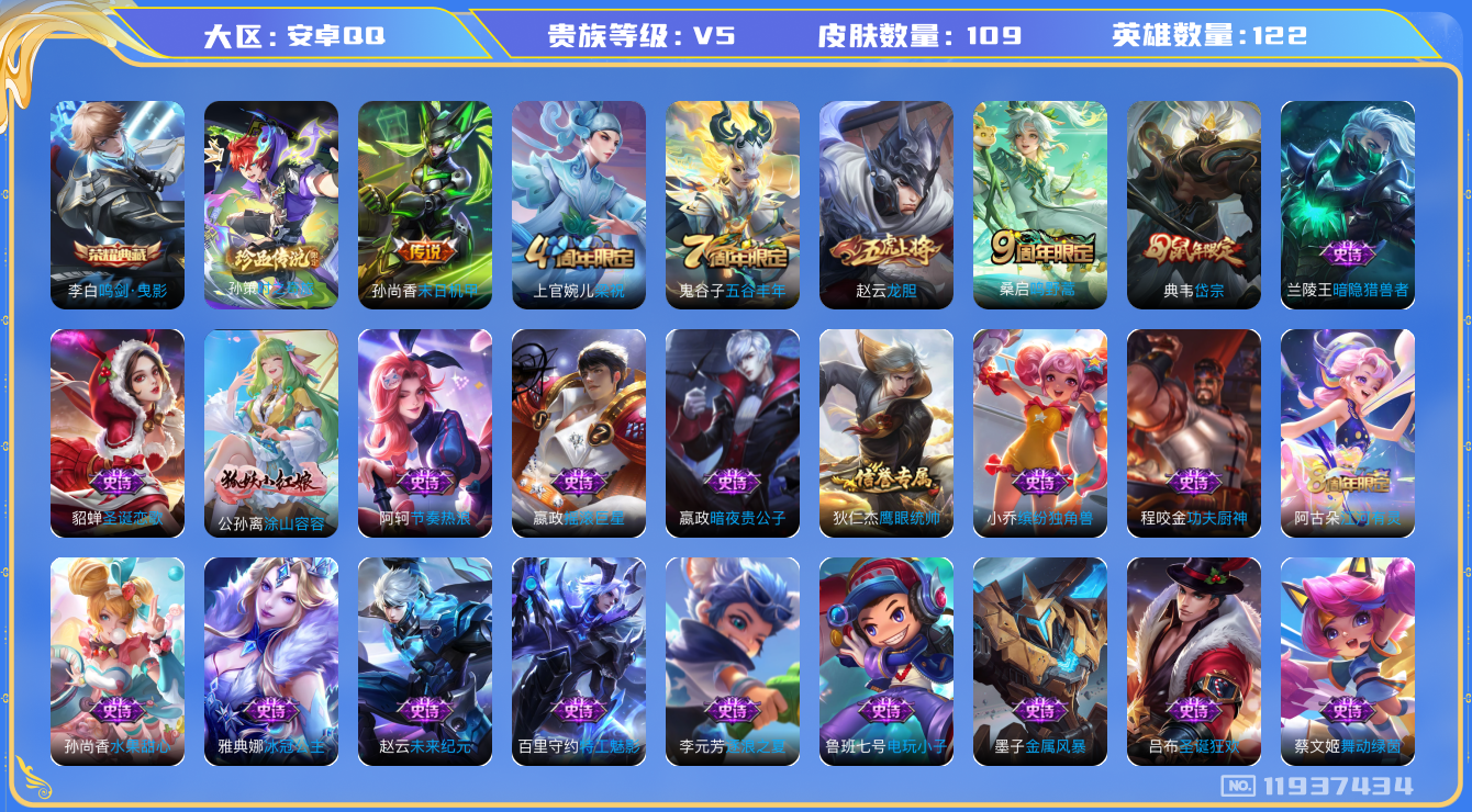 - [11384174]V10 5典藏 2无双 3珍品传说 46传说 125英雄 409皮肤 可修改实名 优质装备:全息碎影(猴子典藏),九霄神辉(木兰典藏),幻阙歌(貂蝉典藏),拾光映像(瑶典藏),器灵·螭龙剑,最初的交响(伽罗典藏),天机白泽,器灵·落星盏,黑崎一护,黄金狮子座,黄金射手座,冠军飞将,云鹰飞将(小将军),绛天战甲(鸡嘴战神),猫影幻舞,久胜战神,炽阳神光,一念神魔,末日机甲-孙尚香(绿蚂蚱),音你心动-小乔,地狱之眼,音你心动-周瑜,李逍遥,乞巧织情,时之恋人-刘备(电焊工),淬星耀世,超时空战士-狄仁杰,挚爱之约,无双飞将,灼幽烈阳,惊梅引,遇见神鼓,霜月吟,艾琳觅芳踪,金乌负日,黄金天蝎座,千劫归真 珍品传说:兔狲·蓬尾 传说皮:典韦战鼓燎原,九山相柳,云诺千山,续相思,祥瑞亨通,幻光神枪 珍宝阁皮:优雅恋人,蔷薇恋人,玩趣恶龙 限定皮:愿照·九州拓(澜年限),愿照·福禄聚(蔡文姬年限),愿照·岁时盈(虞姬年限),愿照·山河定(司空震年限),愿照·众生和(妲己年限),愿照·千秋盛(女娲年限),武陵仙君(小桃花),傲雪梅枪,时雨天司(水龙头),神威(电光马子),高山流水,诗剑行,匿光决锋者,降魔,五谷丰年,青龙志(铠年限),冰锋战神,游园惊梦,御风骁将(吕布年限),逐梦之音,祈雪灵祝(雪兔子),李小龙,如梦令-后羿,猪悟能,引擎之心,百木心枪,玉兔公主,深海之息(深海大菠萝),冰霜神祇 史诗皮:赞萌露比,鸭鸭历险记-刘禅,器灵·浮梦炉,糖绘人间,狼魂孤将,化蝶舞,星界战将,龙之律动,雪豹·霜爪,石田雨龙,百相守梦-周瑜,茶境仙,蔬乡物语(鲁班七号),百相守梦-黄忠,守夜人,遇见神鹿,紫霞仙子,苍穹之光,电玩小子(小书包),黄金分割率,特工魅影,千年之狐,永昼,江河有灵,匿光侦查者,鹤归松栖(赵怀真),魅语,百解令(蒙犽),高渐离燃音魔法,蒙恬荣光圣徽,冰冠公主,青蛇,偶像歌手,白蛇,晚萤,百相守梦(刘备),暗夜猫娘,银翎春语,龙骑士(小龙虾),末日机甲-吕布,猫狗日记-孙策,猫狗日记-大乔,乱世虎臣,节奏热浪,修罗,女仆咖啡,摇滚巨星,水果甜心,绅士熊喵,天才门将,星夜王子,心灵骇客,功夫厨神,德古拉伯爵,暗隐猎兽者,幽灵船长,鬼剑武藏,心灵战警,乐园奇幻夜,天秀·启明,舞动绿茵,地狱岩魂,纤云弄巧,拒霜思,缤纷独角兽,乘风破浪,逐浪之夏,水晶猎龙者,曙光守护者,