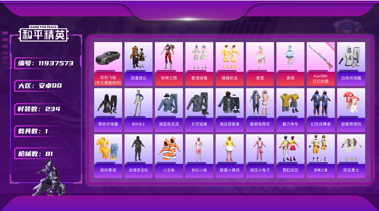 [11937573]5粉装 1特效枪 1载具 1印记 可二次 可修改实名 优质装备:宾利飞驰(布罗德盖棕双色),Kar98K-巳巳如意 热门装扮:牧神之羯,暖暖奶龙,蜜语绒猫,美雪,美琪,浪漫波比 五级特效枪:五级Kar98K-巳巳如意 紫色装扮:SS22特训,SS21特训,SS20特训,冰爽海盐,治愈之星,科技之星,SS14特训,豚鼠丹丹,吉莉礼服,雪兔飞飞,酷萌兔限定,长空猛禽,霓虹街区,缤纷果语,绛羽幽主,魅力单车,黑色伏地魔,龙的传人,龟仙人,冰河战士,龙魂突击队,海岛探路者,幻世战舞者,探宝勇士,湖蓝色名流,疯狂小兔子,白色伏地魔,破蛋小黄鸡,空岛之星,空投萌叽,甜蜜熊情侣,牛气冲天,牛气满满,创世·幻影,纯真浪花,热情海星,SS28特训,巳巳如意,竞技名士,情公主,SS25特训,粉红小猪,焰鹰斗篷,幻羽潜行,幽夜迷踪,SS27特训,无暇誓言,雪晶战甲,小丑鱼,晨曦薄雾,SS26特训,春光漫游,快闪甜心,贝斯之夜,耀粉歌者,萌黄之夏 优质战备:圣堂之誓降落伞,精灵梦叶罗丽降落伞,忍者神龟降落伞,莲影清波降落伞,绝色倾城飞行器