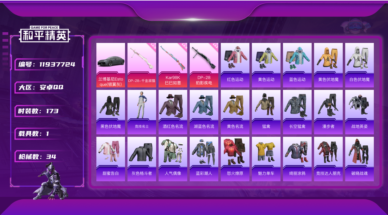 [11937724]3特效枪 1载具 1印记 可二次 可修改实名 优质装备:兰博基尼Estoque(银翼灰),DP-28-千金淑猫,Kar98K-巳巳如意 稀有枪皮:DP-28-豹影疾电 五级特效枪:五级DP-28-千金淑猫 三级特效枪:三级Kar98K-巳巳如意 一级特效枪:一级DP-28-豹影疾电 紫色装扮:SS31特训套装,人气偶像,SS33特训套装,顶瓜瓜,萌趣颜团子,特种颜团子,SS19特训,SS17特训,冰暴轰轰,异彩先驱,SS18特训,酒红色名流,长空猛禽,霓虹极客,缤纷果语,蓝彩潮人,蓝色运动,魅力单车,黄色伏地魔,黄色名流,黄色运动,黑色伏地魔,涂山之恋,深蓝色名流,怒火燎原,战地英姿,湖蓝色名流,绮丽涂鸦,白色伏地魔,破晓战魂,破蛋小黄鸡,甜蜜告白,竞技达人朋克,红色运动,灰色格斗者,猛禽,竞技名士,SS24特训(SS24特训套装),漫步者