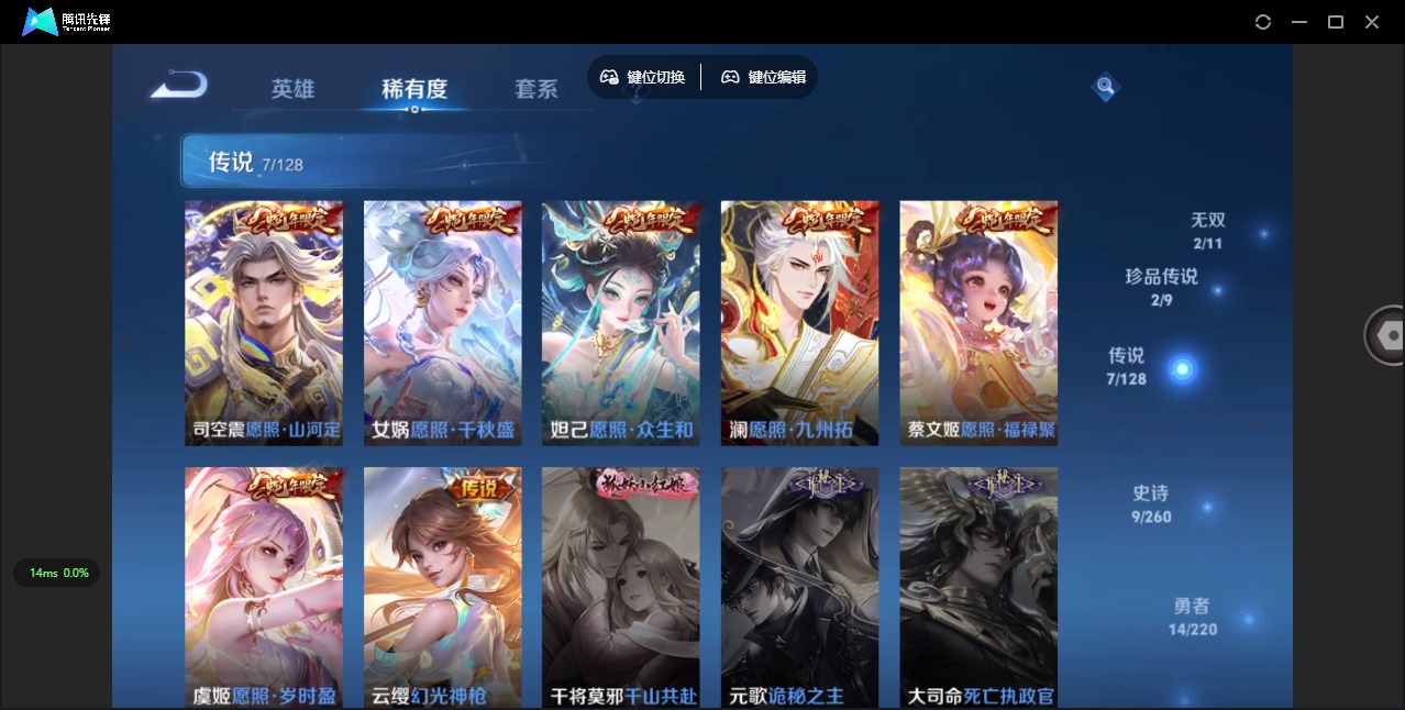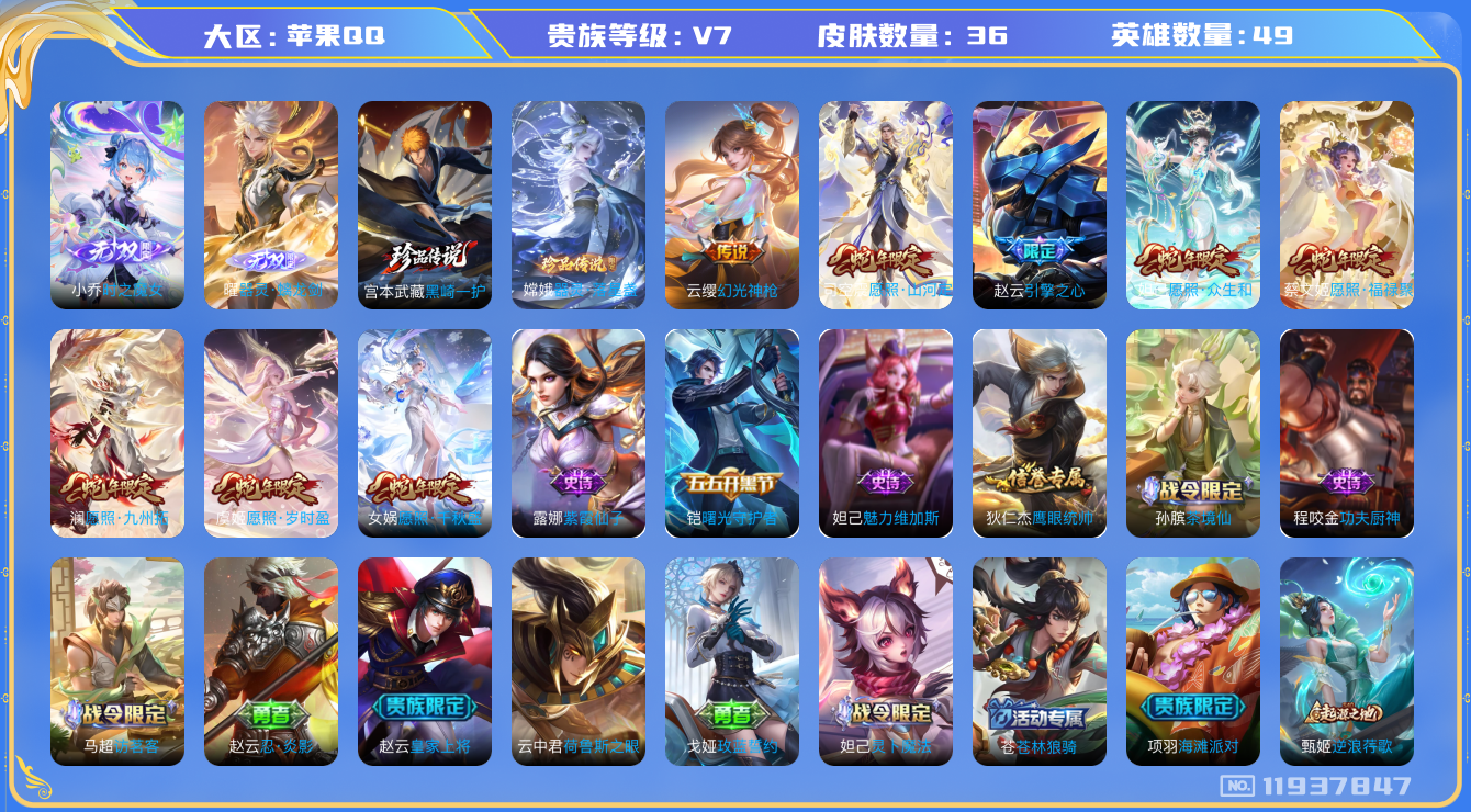 [11937847]V7 2无双 2珍品传说 7传说 49英雄 36皮肤 可修改实名 优质装备:小乔时之魔女(小乔无双),器灵·螭龙剑,器灵·落星盏,黑崎一护 传说皮:幻光神枪 限定皮:愿照·九州拓(澜年限),愿照·福禄聚(蔡文姬年限),愿照·岁时盈(虞姬年限),愿照·山河定(司空震年限),愿照·众生和(妲己年限),愿照·千秋盛(女娲年限),引擎之心 史诗皮:茶境仙,紫霞仙子,功夫厨神,曙光守护者,鹰眼统帅,魅力维加斯
