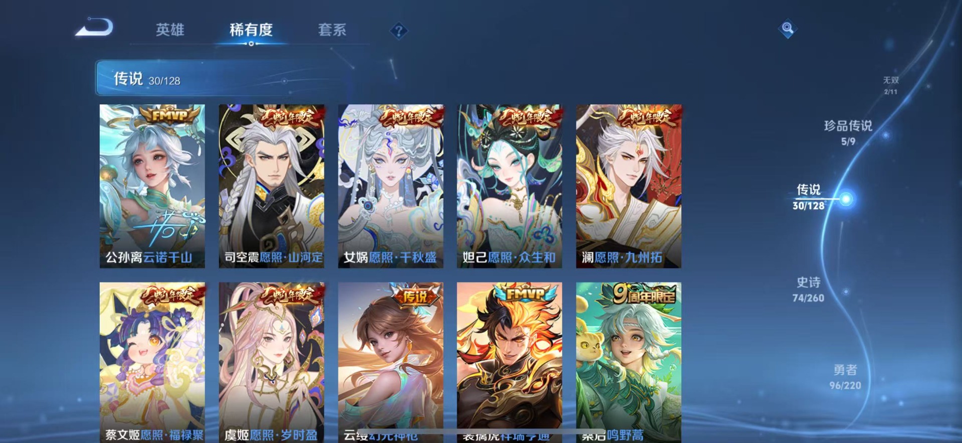 不知火舞绯月行,诸葛亮时雨天司,司空震愿照·山河定,公孙离蜜橘之夏,鲁班大师匿光启智者,马可波罗山海·玄木吟,桑启鸣野蒿,女娲愿照·千秋盛,孙悟空至尊宝,马超神威,云中君时之祈愿,妲己愿照·众生和,韩信傲雪梅枪,蔡文姬愿照·福禄聚,澜愿照·九州拓,虞姬愿照·岁时盈