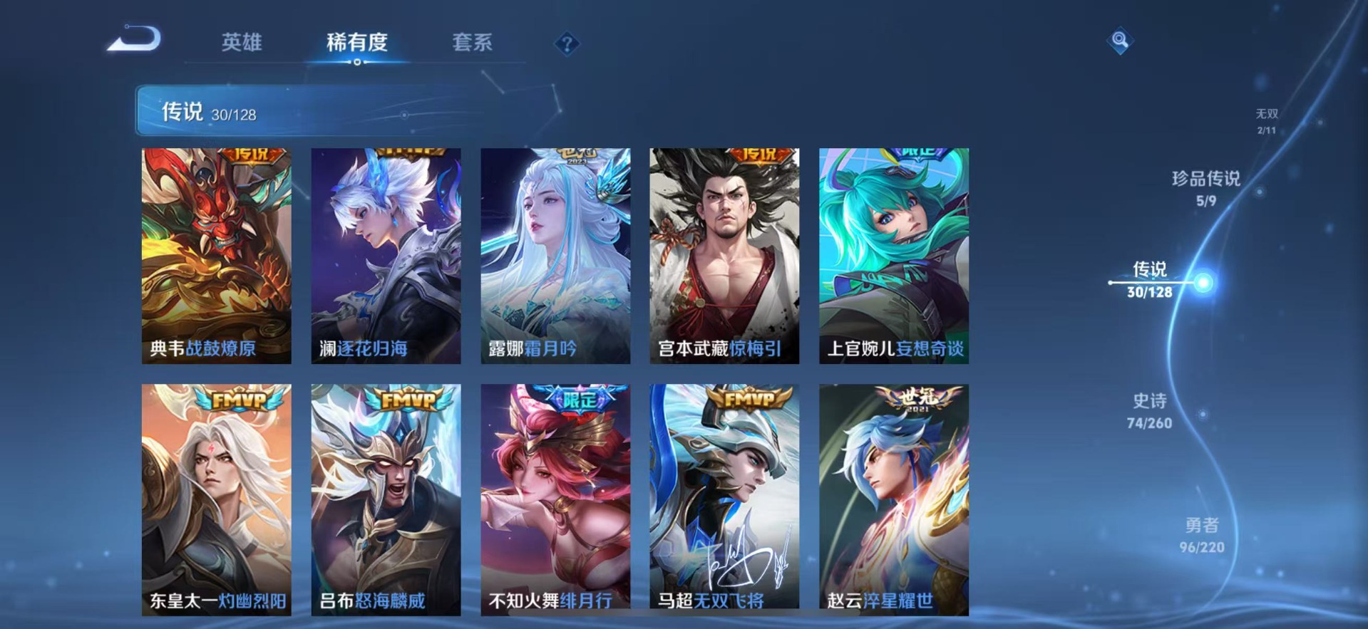 赵云淬星耀世,干将莫邪久胜战神,典韦战鼓燎原,李信一念神魔,达摩黄金狮子座,露娜霜月吟,镜炽阳神光,宫本武藏惊梅引,裴擒虎祥瑞亨通,曜云鹰飞将,马超无双飞将,澜逐花归海,云缨幻光神枪