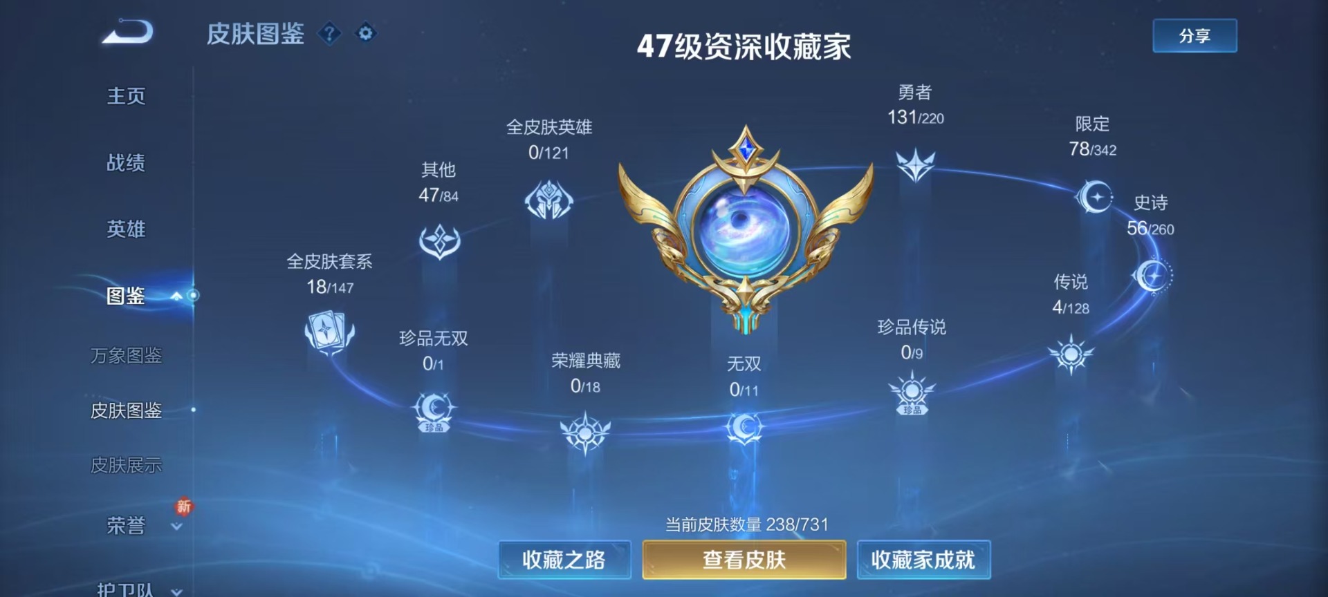 - PX_2093182-54 安卓QQ/至尊星耀/248皮肤/125英雄/2典藏/0珍品无双/0无双/1珍品传说/20传说/63史诗/9稀有英雄 【1 珍品传说】怪盗基德 马可波罗, 【2 典藏皮肤】鸣剑·曳影 李白,弑枪猎影 韩信, 【20 传说皮肤】启明星使 虞姬,逐花归海 澜,云鹰飞将 曜,齐天大圣 孙悟空,诗剑行 李白,浮生妄 夏洛特,记忆之芯 公孙离,地狱之眼 宫本武藏,炽阳神光 镜,霜月