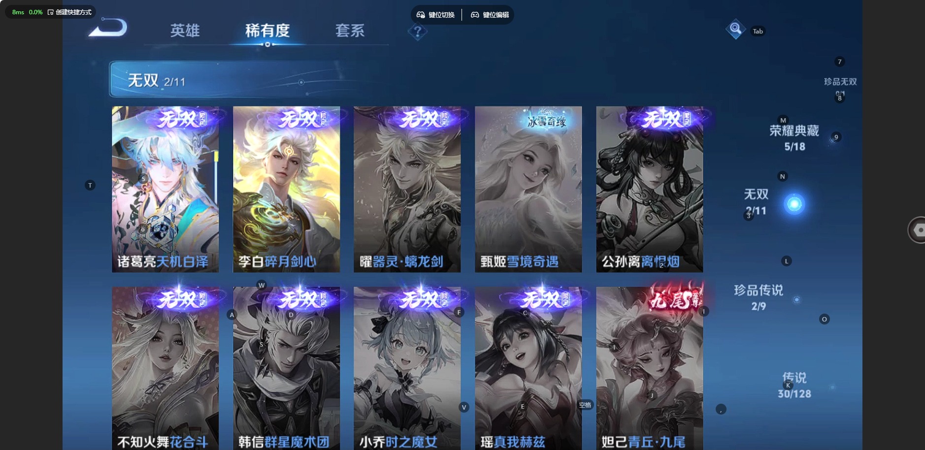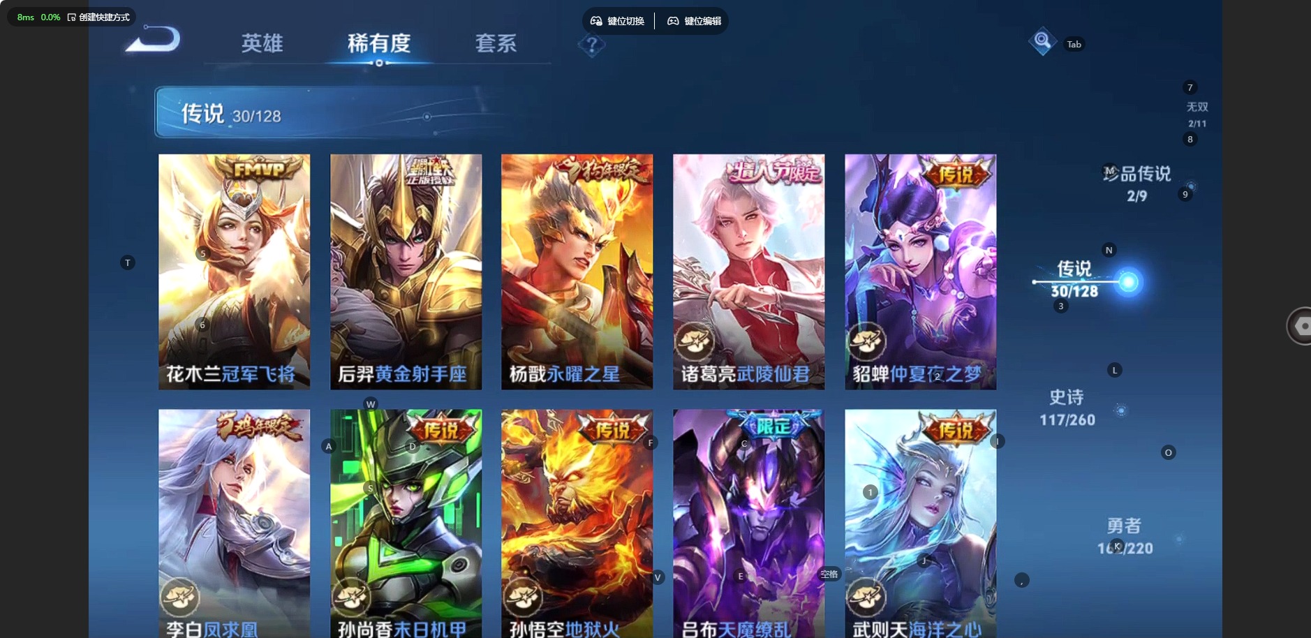 - PX_2091376-贵族8/皮肤300/典藏1/传说19/史诗84/英雄124/星域神启/碎月剑心/蔷薇恋人/优雅恋人/特工战影/天魔缭乱/地狱火/李白凤求凰/仲夏夜之梦/黄金射手座/冠军飞将/白虎志/黄金狮子座/久胜战神/时之恋人男/零号赤焰/启明星使/炽阳神光/绛天战甲/异界灵契/花朝如约/碎云/灼幽烈阳/霜月吟/狰/狄仁杰阴阳师/凯尔特女王/赵云皇家上将/优雅恋人/蔷薇恋人/异界灵契/狮舞