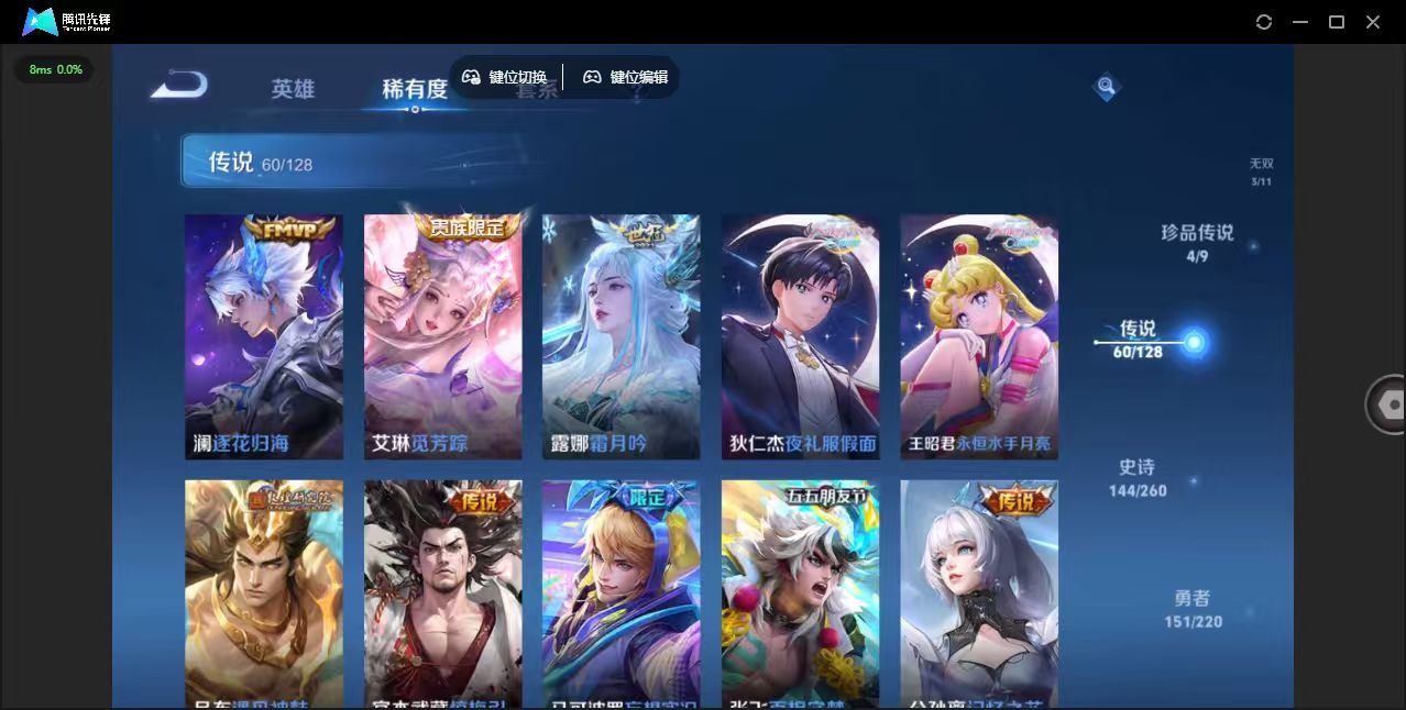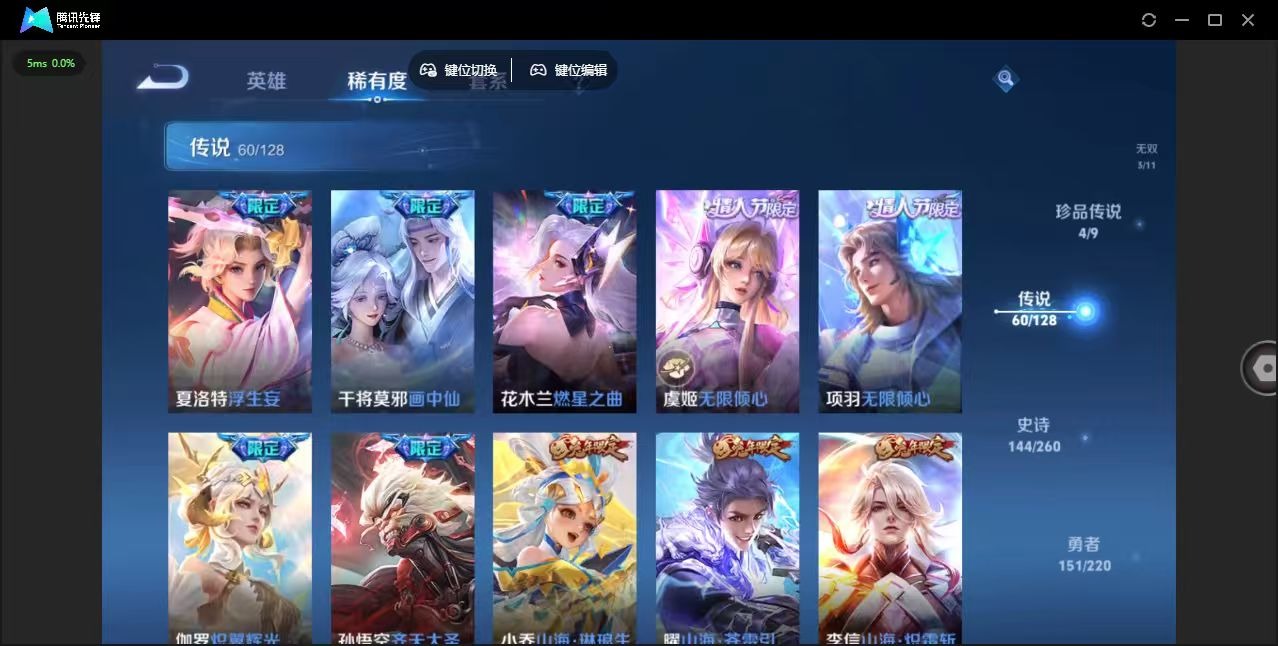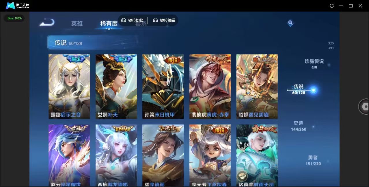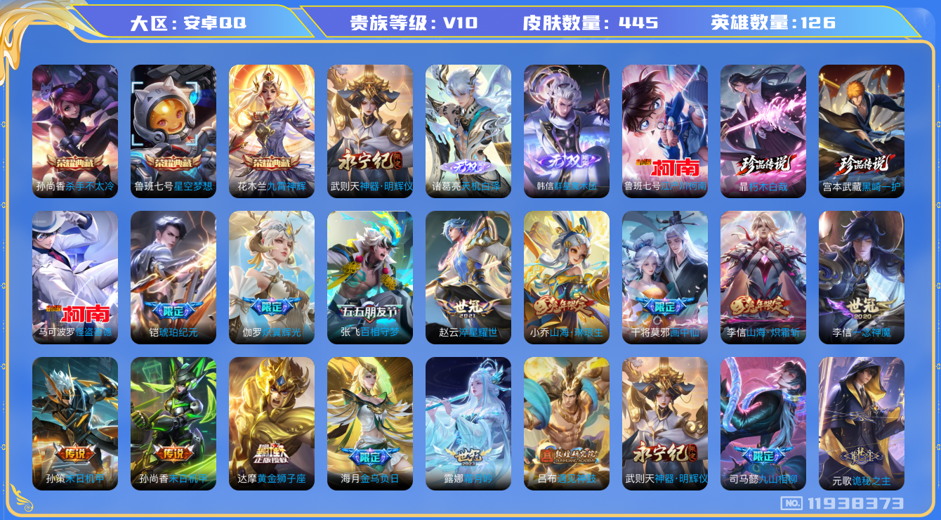 - [12277718]V8 1典藏 1无双 2珍品传说 12传说 123英雄 323皮肤 可修改实名 优质装备:鸣剑·曳影,器灵·螭龙剑,怪盗基德,黑崎一护,黄金狮子座,云鹰飞将(小将军),炽阳神光,末日机甲-孙尚香(绿蚂蚱),地狱之眼,无双飞将,涂山容容 珍宝阁皮:妄想食味,玩趣恶龙 限定皮:愿照·九州拓(澜年限),愿照·山河定(司空震年限),逐霄战戟,鸣野蒿,至尊宝,傲雪梅枪,神威(电光马子),高山流水,诗剑行,五谷丰年,游园惊梦,李小龙,一生所爱,匿光追影者,寅虎·赤拳(老虎年限),山海·玄木吟(马可年限) 史诗皮:鸭鸭历险记-刘禅,器灵·浮梦炉,化蝶舞,星界战将,谪仙醉月,龙之律动,石田雨龙,百相守梦-周瑜,茶境仙,破空之剑,战舞者,东方月初,蒙犽顽岩魄,埋骨钱,蔬乡物语(鲁班七号),超元猎域,百相守梦-百里守约,百相守梦-黄忠,织梦人,紫霞仙子,苍穹之光,黄金分割率,特工魅影,千年之狐,永昼,江河有灵,魅语,百解令(蒙犽),高渐离燃音魔法,蒙恬荣光圣徽,无限星赏官,冰冠公主,晚萤,电玩·爆裂旋风,末日机甲-吕布,乱世虎臣,节奏热浪,修罗,女仆咖啡,摇滚巨星,水果甜心,绅士熊喵,天才门将,星夜王子,心灵骇客,功夫厨神,暗隐猎兽者,幽灵船长,鬼剑武藏,暗渊魔法,乐园奇幻夜,舞动绿茵,地狱岩魂,纤云弄巧,拒霜思,缤纷独角兽,乘风破浪,逐浪之夏,月团寄思,水晶猎龙者,曙光守护者,热力回旋,箭羽风息,金属风暴,原初追逐者,圣诞狂欢,圣诞恋歌,鹰眼统帅,暗夜贵公子,魅力维加斯,黎明之约,赏金猎手,无心