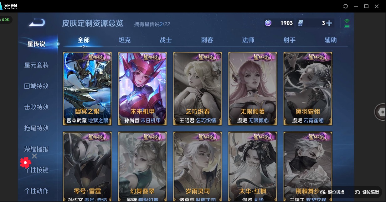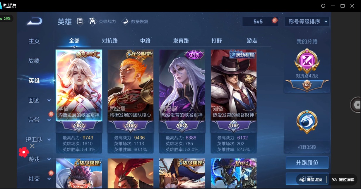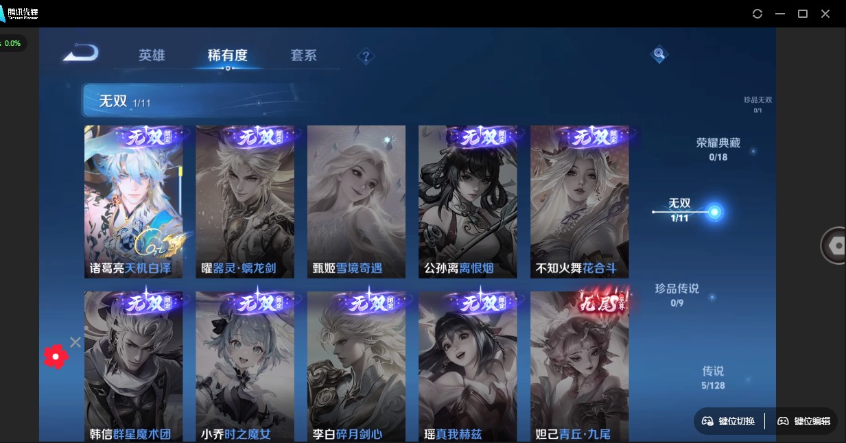 - [11658500]V6 1珍品传说 5传说 124英雄 207皮肤 可修改实名 珍品传说:时之奇旅-孙策 传说皮:幻光神枪,地狱之眼,云鹰飞将(小将军),炽阳神光 珍宝阁皮:妄想食味,蔷薇恋人 限定皮:鸣野蒿,飞衡(韩信年限),遇见飞天,高山流水,五谷丰年,游园惊梦,梁祝,李小龙,猪悟能,大圣娶亲,引擎之心,冰霜恋舞曲 史诗皮:化蝶舞,破空之剑,苍穹之光,电玩小子(小书包),黄金分割率,特工魅影,千年之狐,江河有灵,青蛇,龙骑士(小龙虾),乱世虎臣,修罗,女仆咖啡,水果甜心,天才门将,星夜王子,心灵骇客,功夫厨神,暗隐猎兽者,幽灵船长,鬼剑武藏,心灵战警,舞动绿茵,地狱岩魂,缤纷独角兽,乘风破浪,逐浪之夏,水晶猎龙者,曙光守护者,金属风暴,原初追逐者,圣诞恋歌,鹰眼统帅,黎明之约,无心