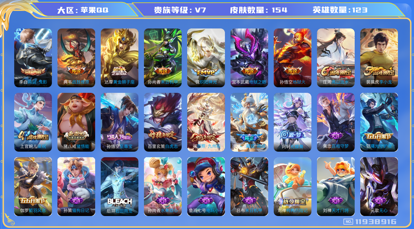 [11938916]V7 1典藏 8传说 123英雄 154皮肤 可修改实名 优质装备:鸣剑·曳影,黄金狮子座,炽阳神光,末日机甲-孙尚香(绿蚂蚱),地狱火,地狱之眼,涂山容容 传说皮:典韦战鼓燎原 珍宝阁皮:女武神 限定皮:愿照·九州拓(澜年限),至尊宝,白虎志(电光耗子),高山流水,梁祝,李小龙,猪悟能 史诗皮:鸭鸭历险记-刘禅,化蝶舞,龙之律动,藏狐·褐绒,石田雨龙,百相守梦-黄忠,电玩小子(小书包),白龙吟,特工魅影,末日机甲-莱西奥,偶像歌手,龙骑士(小龙虾),末日机甲-吕布,猫狗日记-孙策,水果甜心,天才门将,星夜王子,功夫厨神,鬼剑武藏,纤云弄巧,曙光守护者,箭羽风息,金属风暴,原初追逐者,鹰眼统帅,黎明之约,无心