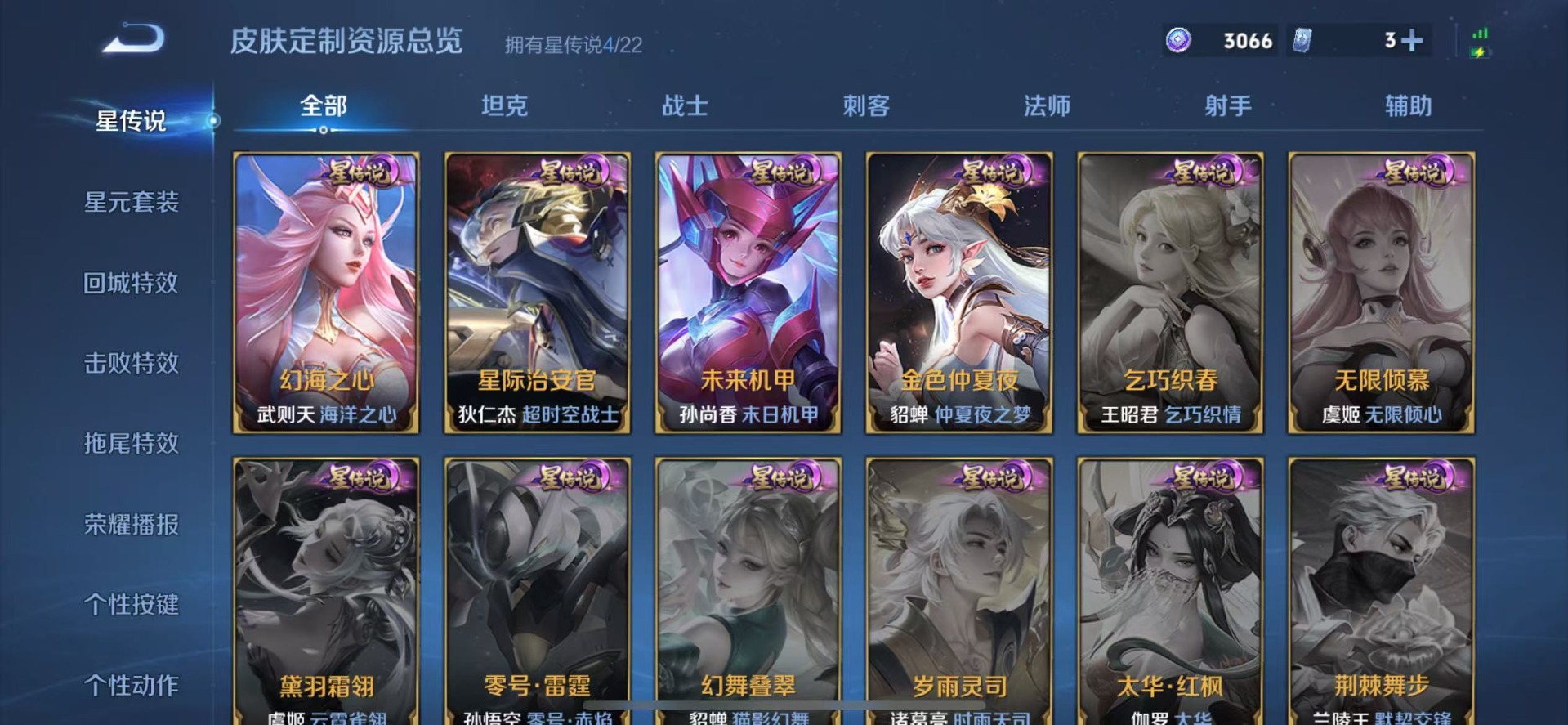哪吒逐梦之翼,甄姬幽恒,曹操天狼征服者,伽罗太华,干将莫邪冰霜恋舞曲,典韦岱宗,项羽霸王别姬,吕布御风骁将,后羿辉光之辰,庄周玄嵩,公孙离蜜橘之夏,裴擒虎李小龙,裴擒虎天狼狩猎者,上官婉儿梁祝,花木兰默契交锋,花木兰青春决赛季,安琪拉魔法小厨娘,马可波罗逐梦之星,马可波罗山海·玄木吟,猪八戒猪悟能,孙悟空孙行者,孙悟空至尊宝,百里玄策白虎志,雅典娜神奇女侠,妲己时之彼端,韩信飞衡,韩信逐梦之影,蔡文姬奇迹圣诞,虞姬霸王别姬,王昭君凤凰于飞,王昭君星穹之声,关羽冰锋战神