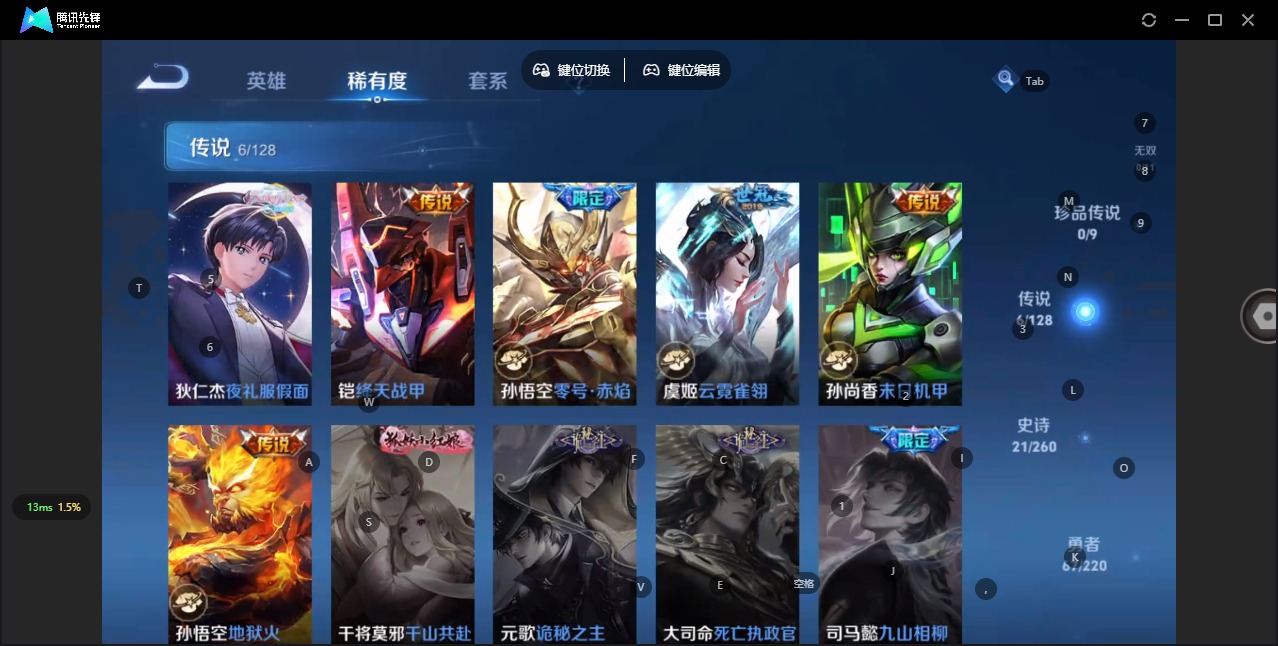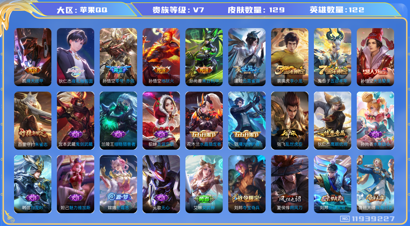- [11742713]V7 7传说 122英雄 261皮肤 可修改实名 优质装备:地狱火,仲夏夜之梦(大飞蛾),山海·炽霜斩(李信年限),琥珀纪元铠,琥珀纪元马超 珍宝阁皮:万物之道,优雅恋人,蔷薇恋人 限定皮:逐霄战戟,鸣野蒿,至尊宝,魔法小厨娘,高山流水,五谷丰年,游园惊梦,梁祝,逐梦之翼,李小龙,永曜之星,猪悟能,青春决赛季,美猴王,山海·玄木吟(马可年限) 史诗皮:化蝶舞,怒海争锋,埋骨钱,芈月浮光幕影,紫霞仙子,苍穹之光,白龙吟,黄金分割率,特工魅影,千年之狐,江河有灵,魅语,蒙恬荣光圣徽,偶像歌手,暗夜猫娘,龙骑士(小龙虾),末日机甲-吕布,修罗,女仆咖啡,水果甜心,绅士熊喵,星夜王子,心灵骇客,功夫厨神,幽灵船长,鬼剑武藏,心灵战警,舞动绿茵,地狱岩魂,纤云弄巧,逐浪之夏,水晶猎龙者,箭羽风息,金属风暴,原初追逐者,圣诞狂欢,圣诞恋歌,鹰眼统帅,黎明之约,赏金猎手,无心