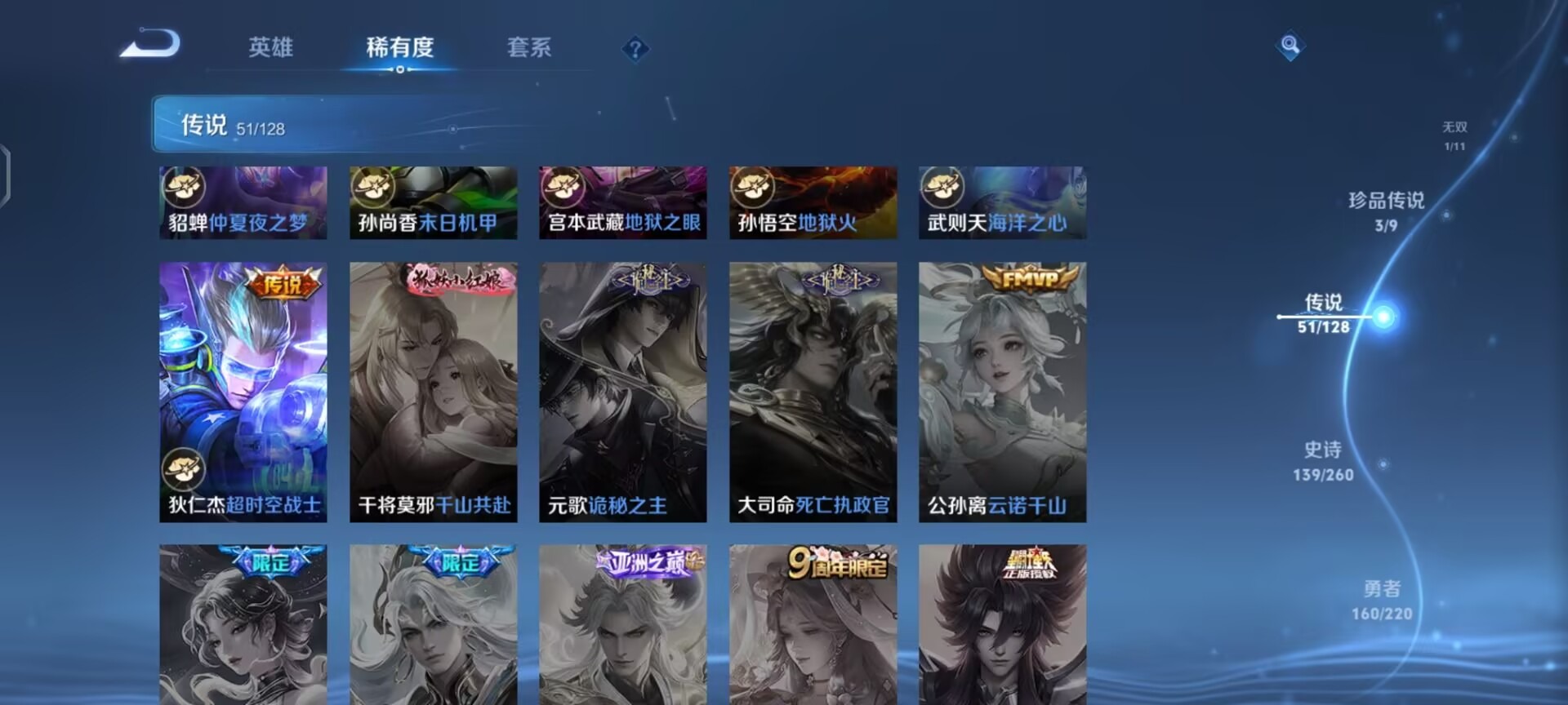 - [11553578]V6 1传说 125英雄 187皮肤 可修改实名 珍宝阁皮:胡桃夹子 限定皮:鸣野蒿,至尊宝,时之彼端,游园惊梦,梁祝,李小龙,朱雀志(守约年限) 史诗皮:星界战将,龙之律动,琥珀纪元伽罗,百相守梦-黄忠,紫霞仙子,特工魅影,江河有灵,偶像歌手,时之恋人-孙尚香,节奏热浪,水果甜心,星夜王子,功夫厨神,暗隐猎兽者,幽灵船长,鬼剑武藏,心灵战警,地狱岩魂,纤云弄巧,缤纷独角兽,乘风破浪,水晶猎龙者,曙光守护者,箭羽风息,原初追逐者,圣诞恋歌,鹰眼统帅,魅力维加斯,未来纪元-赵云
