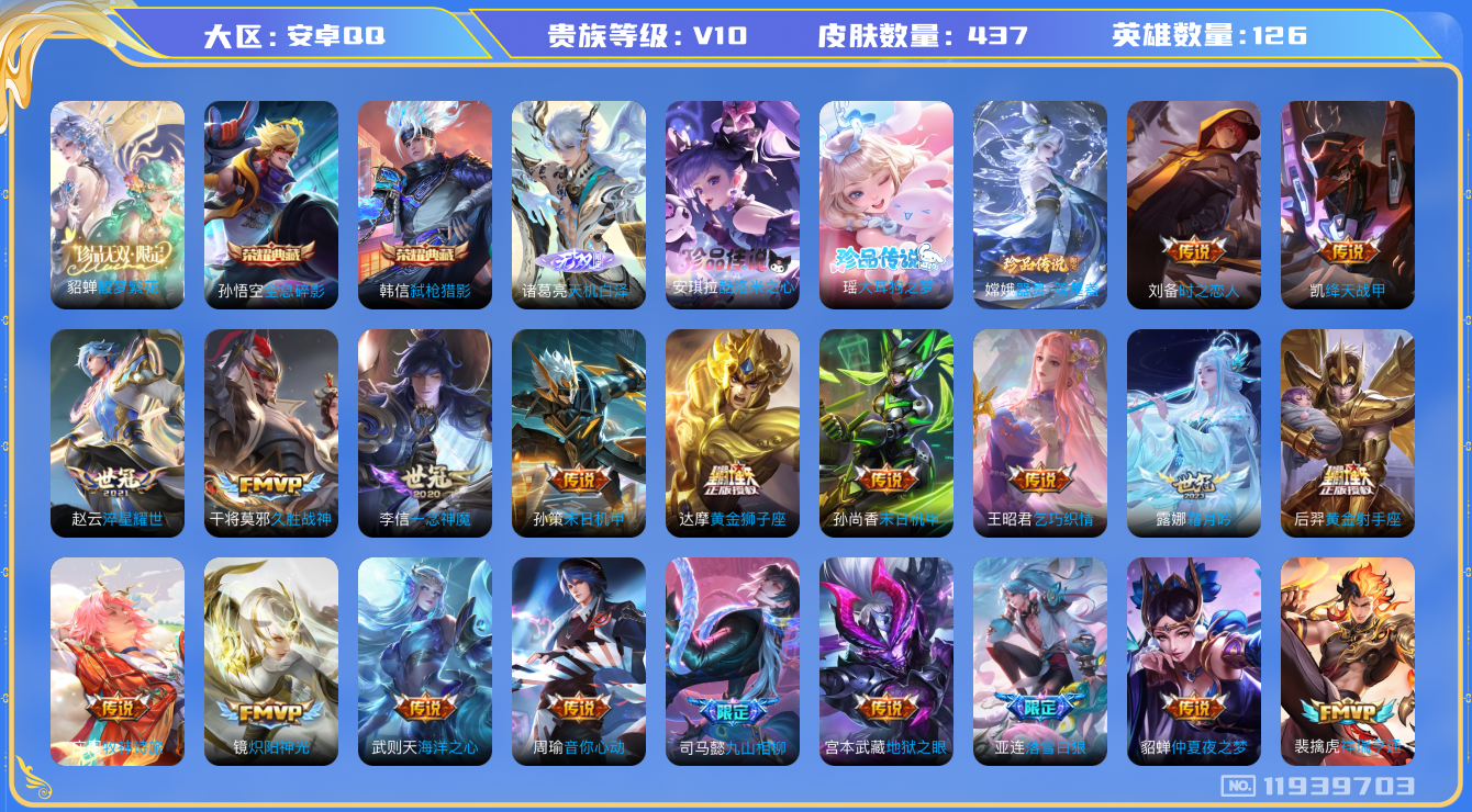 [11939703]V10 2典藏 1珍品无双 1无双 3珍品传说 51传说 126英雄 437皮肤 典藏英雄武则天 可修改实名 优质装备:馥梦繁花,全息碎影(猴子典藏),弑枪猎影(韩信典藏),天机白泽,器灵·落星盏,酷洛米之心,大耳狗之梦,黄金狮子座,黄金射手座,云鹰飞将(小将军),绛天战甲(鸡嘴战神),黄金白羊座,猫影幻舞,久胜战神,炽阳神光,一念神魔,末日机甲-孙尚香(绿蚂蚱),地狱火,仲夏夜之梦(大飞蛾),海洋之心,地狱之眼,飞鸢探春,音你心动-周瑜,乞巧织情,时之恋人-刘备(电焊工),游龙清影(小青龙),淬星耀世,超时空战士-狄仁杰,末日机甲-孙策,无双飞将,碎云,电玩·雷克斯,灼幽烈阳,妄想实况,妄想奇谈,霜月吟,澜逐花归海,艾琳觅芳踪,牧神诗旅,涂山容容 传说皮:落雪白狼,九山相柳,续相思,祥瑞亨通,幻光神枪 珍宝阁皮:妄想食味,女武神,玩趣恶龙 限定皮:愿照·九州拓(澜年限),愿照·福禄聚(蔡文姬年限),愿照·岁时盈(虞姬年限),愿照·山河定(司空震年限),愿照·众生和(妲己年限),愿照·千秋盛(女娲年限),鸣野蒿,夏侯惇霜北刀,至尊宝,武陵仙君(小桃花),傲雪梅枪,寅虎·展翼(孙膑年限),魔法小厨娘,时雨天司(水龙头),遇见飞天,高山流水,诗剑行,齐天大圣,怒海麟威,五谷丰年,冰锋战神,游园惊梦,梁祝,岱宗(典韦年限),李小龙,逐梦之影,朱雀志(守约年限),孙行者,大圣娶亲,寅虎·御盾(廉颇年限),时之奇旅-妲己 史诗皮:鸭鸭历险记-刘禅,飞车小橘子,苍鳞隐世,器灵·浮梦炉,狼魂孤将,绮世丹青,灵蛊蚀心,星界战将,龙之律动,雪豹·霜爪,藏狐·褐绒,小牛鸭,石田雨龙,百相守梦-周瑜,戍鼓铭心,茶境仙,幻珠鲛人,破空之剑,琥珀纪元伽罗,奇遇星旅,蔬乡物语(鲁班七号),星界特工,百相守梦-黄忠,遇见神鹿,紫霞仙子,苍穹之光,电玩小子(小书包),黄金分割率,特工魅影,千年之狐,永昼,江河有灵,末日机甲-莱西奥,真我赫兹(百里守约),浮梦罗烟,闲日渔趣,魅语,百解令(蒙犽),高渐离燃音魔法,蒙恬荣光圣徽,无限星赏官,冰冠公主,青蛇,偶像歌手,白蛇,晚萤,电玩·爆裂旋风,暗夜猫娘,银翎春语,龙骑士(小龙虾),末日机甲-吕布,猫狗日记-孙策,猫狗日记-大乔,时之恋人-孙尚香,乱世虎臣,节奏热浪,修罗,女仆咖啡,摇滚巨星,水果甜心,绅士熊喵,天才门将,星夜王子,心灵骇客,功夫厨
