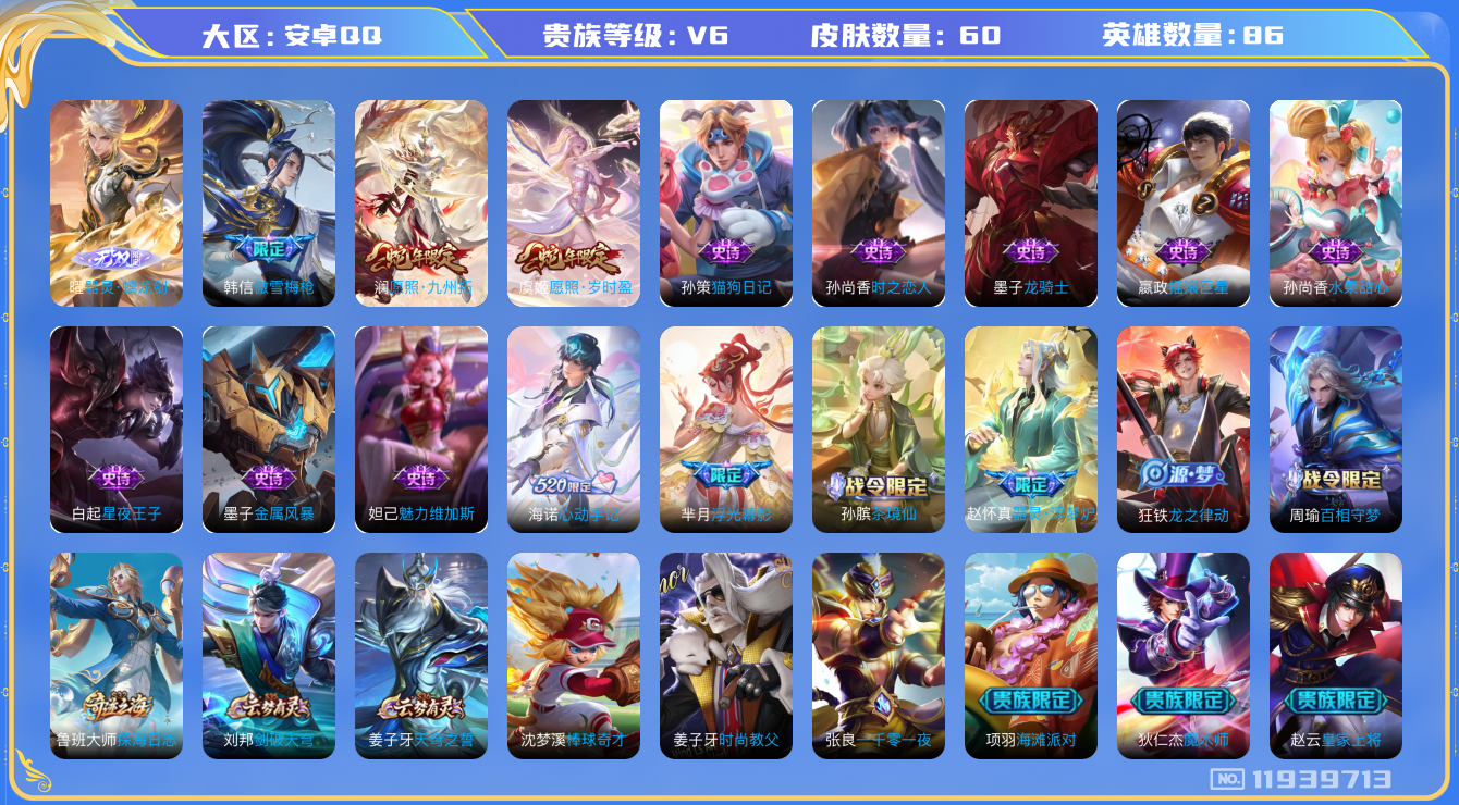 - [12090066]V7 1典藏 8传说 123英雄 178皮肤 可修改实名 优质装备:无限飓风号(高达),云鹰飞将(小将军),炽阳神光,零号·赤焰,黄金天蝎座 传说皮:幻光神枪 珍宝阁皮:妄想食味,蔷薇恋人 限定皮:逐霄战戟,鸣野蒿,至尊宝,凤求凰(白切鸡),五谷丰年,烈魂,岱宗(典韦年限),天狼征服者,逐梦之影,默契交锋-花木兰,天魔缭乱 史诗皮:化蝶舞,破空之剑,海诺心动手记,决胜骁骑,蔬乡物语(鲁班七号),紫霞仙子,黄金分割率,特工魅影,高渐离燃音魔法,蒙恬荣光圣徽,冰冠公主,晚萤,电玩·爆裂旋风,末日机甲-吕布,猫狗日记-孙策,时之恋人-孙尚香,节奏热浪,摇滚巨星,水果甜心,绅士熊喵,星夜王子,心灵骇客,功夫厨神,德古拉伯爵,暗隐猎兽者,幽灵船长,鬼剑武藏,心灵战警,地狱岩魂,繁星吟游(呼啦呼啦),缤纷独角兽,乘风破浪,逐浪之夏,曙光守护者,热力回旋,金属风暴,原初追逐者,圣诞恋歌,鹰眼统帅,魅力维加斯,赏金猎手,未来纪元-赵云