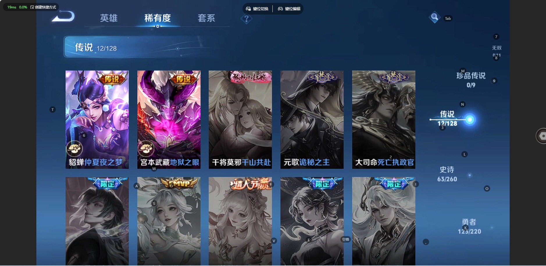 - [12088774]V7 1典藏 5传说 124英雄 224皮肤 可修改实名 优质装备:九霄神辉(木兰典藏),一念神魔,零号·赤焰 传说皮:幻光神枪 珍宝阁皮:蔷薇恋人,玩趣恶龙 限定皮:愿照·千秋盛(女娲年限),鸣野蒿,至尊宝,遇见飞天,五谷丰年,梁祝,李小龙 史诗皮:器灵·浮梦炉,化蝶舞,百相守梦-百里守约,紫霞仙子,电玩小子(小书包),特工魅影,电玩·爆裂旋风,偶像歌手,龙骑士(小龙虾),无限星赏官,末日机甲-吕布,猫狗日记-孙策,乱世虎臣,节奏热浪,摇滚巨星,水果甜心,绅士熊喵,天才门将,星夜王子,心灵骇客,德古拉伯爵,暗隐猎兽者,幽灵船长,鬼剑武藏,心灵战警,纤云弄巧,繁星吟游(呼啦呼啦),乘风破浪,逐浪之夏,水晶猎龙者,曙光守护者,箭羽风息,金属风暴,圣诞狂欢,鹰眼统帅,魅力维加斯,黎明之约,无心,未来纪元-赵云