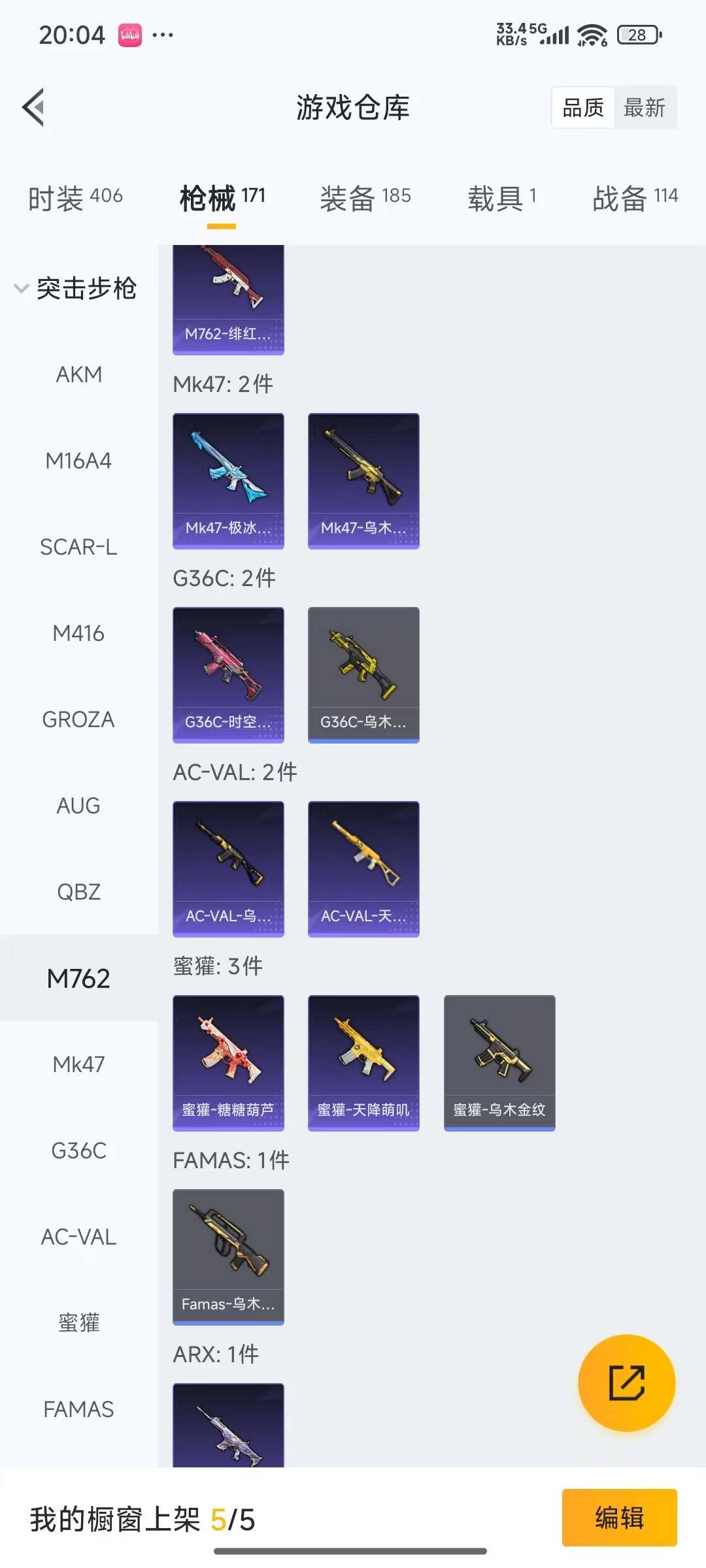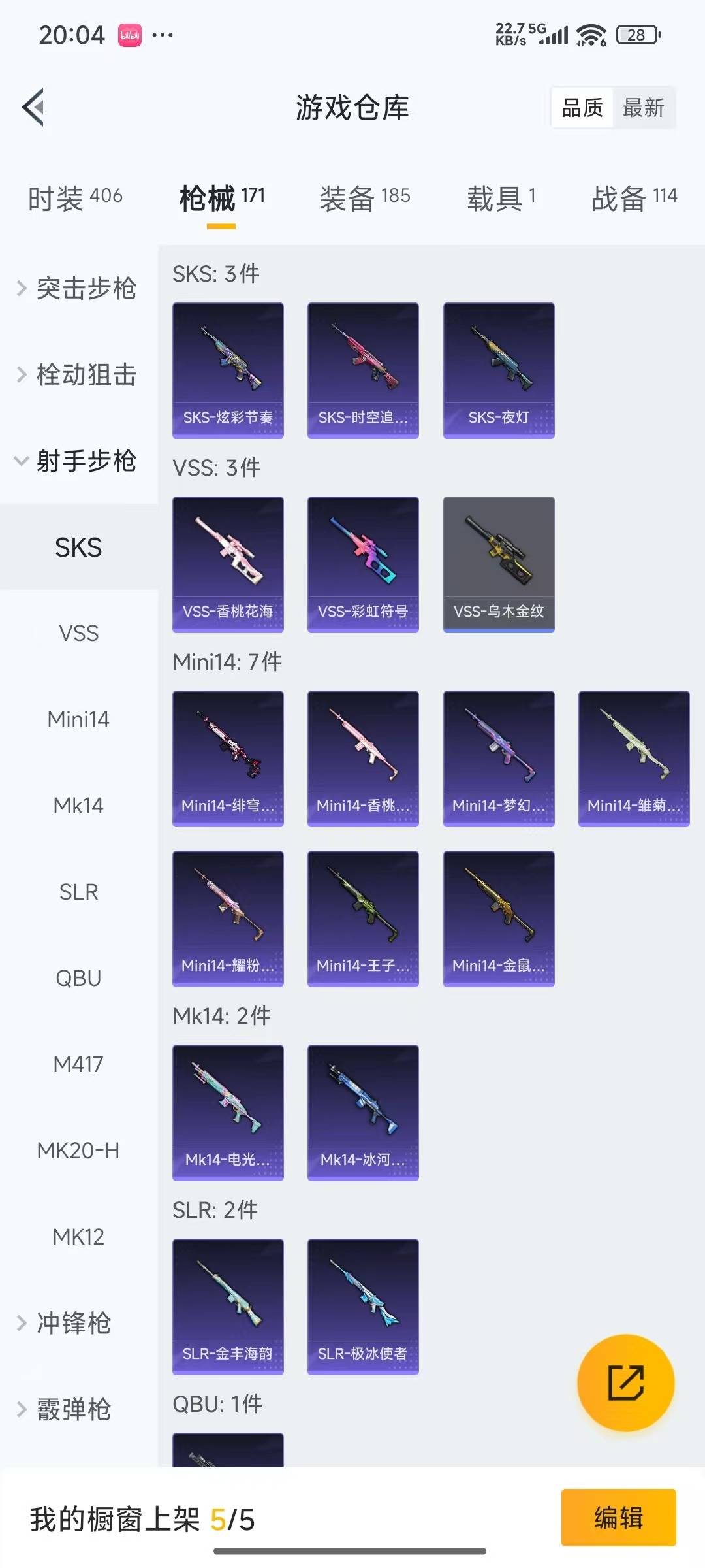SCAR-L-锦绣绵绵,SCAR-L-纯梦嫁纱,M416-心之恋语,M416-电玩时刻,GROZA-镜光银凌,M762-电糖天使,M762-青锋波束,Kar98K-巳巳如意,UMP45-量子极限
