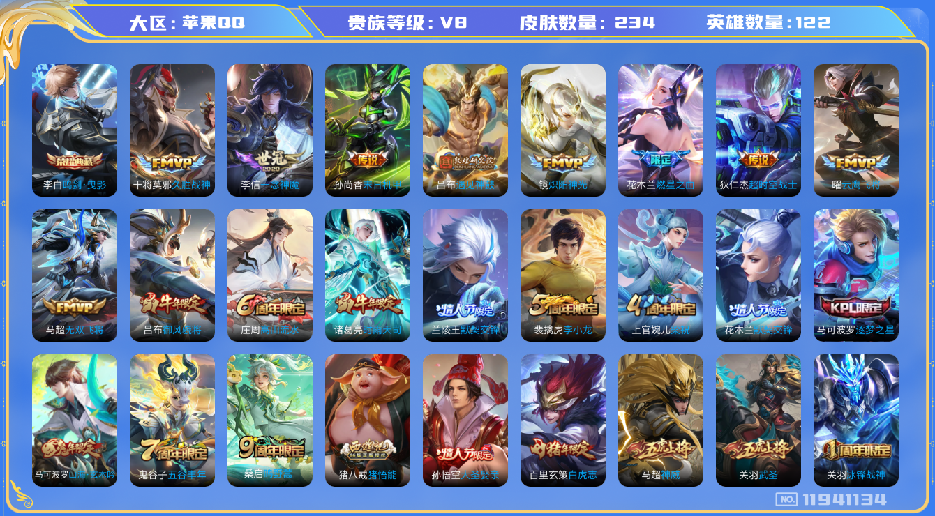 [11941134]V8 1典藏 15传说 122英雄 234皮肤 可修改实名 优质装备:鸣剑·曳影,云鹰飞将(小将军),久胜战神,炽阳神光,一念神魔,末日机甲-孙尚香(绿蚂蚱),超时空战士-狄仁杰,无双飞将,燃星之曲,遇见神鼓 珍宝阁皮:蔷薇恋人,女武神 限定皮:鸣野蒿,白虎志(电光耗子),时雨天司(水龙头),神威(电光马子),高山流水,五谷丰年,冰锋战神,武圣,梁祝,御风骁将(吕布年限),逐梦之星,李小龙,默契交锋-兰陵王,默契交锋-花木兰,猪悟能,大圣娶亲,山海·玄木吟(马可年限) 史诗皮:鸭鸭历险记-刘禅,星界战将,龙之律动,紫霞仙子,电玩小子(小书包),黄金分割率,特工魅影,千年之狐,永昼,江河有灵,魅语,蒙恬荣光圣徽,冰冠公主,偶像歌手,晚萤,电玩·爆裂旋风,猫狗日记-孙策,修罗,摇滚巨星,水果甜心,星夜王子,德古拉伯爵,暗隐猎兽者,幽灵船长,鬼剑武藏,暗渊魔法,心灵战警,天秀·启明,舞动绿茵,地狱岩魂,纤云弄巧,乘风破浪,逐浪之夏,水晶猎龙者,金属风暴,原初追逐者,圣诞狂欢,鹰眼统帅,魅力维加斯,黎明之约,无心