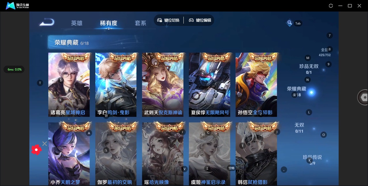 - [11820046]V6 3珍品传说 4传说 98英雄 98皮肤 可修改实名 优质装备:江户川柯南,怪盗基德,器灵·落星盏 传说皮:幻光神枪 限定皮:愿照·九州拓(澜年限),愿照·岁时盈(虞姬年限),逐霄战戟,鸣野蒿 史诗皮:鸭鸭历险记-刘禅,器灵·浮梦炉,糖绘人间,化蝶舞,星界战将,龙之律动,茶境仙,破空之剑,芈月浮光幕影,蔬乡物语(鲁班七号),百相守梦-百里守约,星界特工,紫霞仙子,苍穹之光,蒙恬荣光圣徽,偶像歌手,猫狗日记-孙策,女仆咖啡,水果甜心,星夜王子,暗隐猎兽者,幽灵船长,鬼剑武藏,乐园奇幻夜,舞动绿茵,地狱岩魂,曙光守护者,金属风暴,鹰眼统帅,魅力维加斯,天秀·音浪