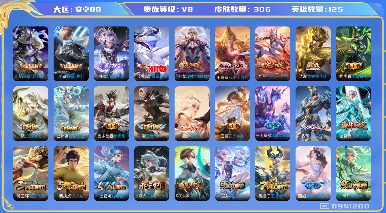 [11941200]V8 2典藏 1无双 1珍品传说 16传说 125英雄 306皮肤 可修改实名 优质装备:鸣剑·曳影,银白咏叹调(倪克斯侍卫),韩信群星魔术团(韩信无双),怪盗基德,黄金狮子座,云鹰飞将(小将军),炽阳神光,末日机甲-孙尚香(绿蚂蚱),山海·炽霜斩(李信年限),惊梅引,千山共赴,涂山容容 传说皮:乘龙·淬吴钩(孙策年限),貂蝉曦玄引,云诺千山,幻光神枪 珍宝阁皮:妄想食味,优雅恋人,玩趣恶龙 限定皮:愿照·九州拓(澜年限),愿照·千秋盛(女娲年限),逐霄战戟,陌上桑,鸣野蒿,至尊宝,时雨天司(水龙头),至美·乘鲤谣,遇见飞天,五谷丰年,梁祝,李小龙,大圣娶亲,冰霜恋舞曲,神器·万象笔,山海·玄木吟(马可年限) 史诗皮:赞萌露比,器灵·浮梦炉,星界战将,龙之律动,石田雨龙,百相守梦-周瑜,怒海争锋,破空之剑,涂山红红,东方月初,琥珀纪元伽罗,上官婉儿群星魔术团,蔬乡物语(鲁班七号),百相守梦-黄忠,织梦人,守夜人,紫霞仙子,电玩小子(小书包),黄金分割率,特工魅影,千年之狐,江河有灵,魅语,百解令(蒙犽),高渐离燃音魔法,蒙恬荣光圣徽,无限星赏官,冰冠公主,青蛇,偶像歌手,白蛇,暗夜猫娘,龙骑士(小龙虾),末日机甲-吕布,猫狗日记-孙策,猫狗日记-大乔,时之恋人-孙尚香,乱世虎臣,节奏热浪,修罗,女仆咖啡,摇滚巨星,水果甜心,绅士熊喵,星夜王子,心灵骇客,功夫厨神,德古拉伯爵,暗隐猎兽者,幽灵船长,鬼剑武藏,心灵战警,舞动绿茵,地狱岩魂,纤云弄巧,缤纷独角兽,乘风破浪,逐浪之夏,水晶猎龙者,热力回旋,箭羽风息,金属风暴,原初追逐者,圣诞狂欢,圣诞恋歌,鹰眼统帅,暗夜贵公子,赏金猎手,无心,未来纪元-赵云