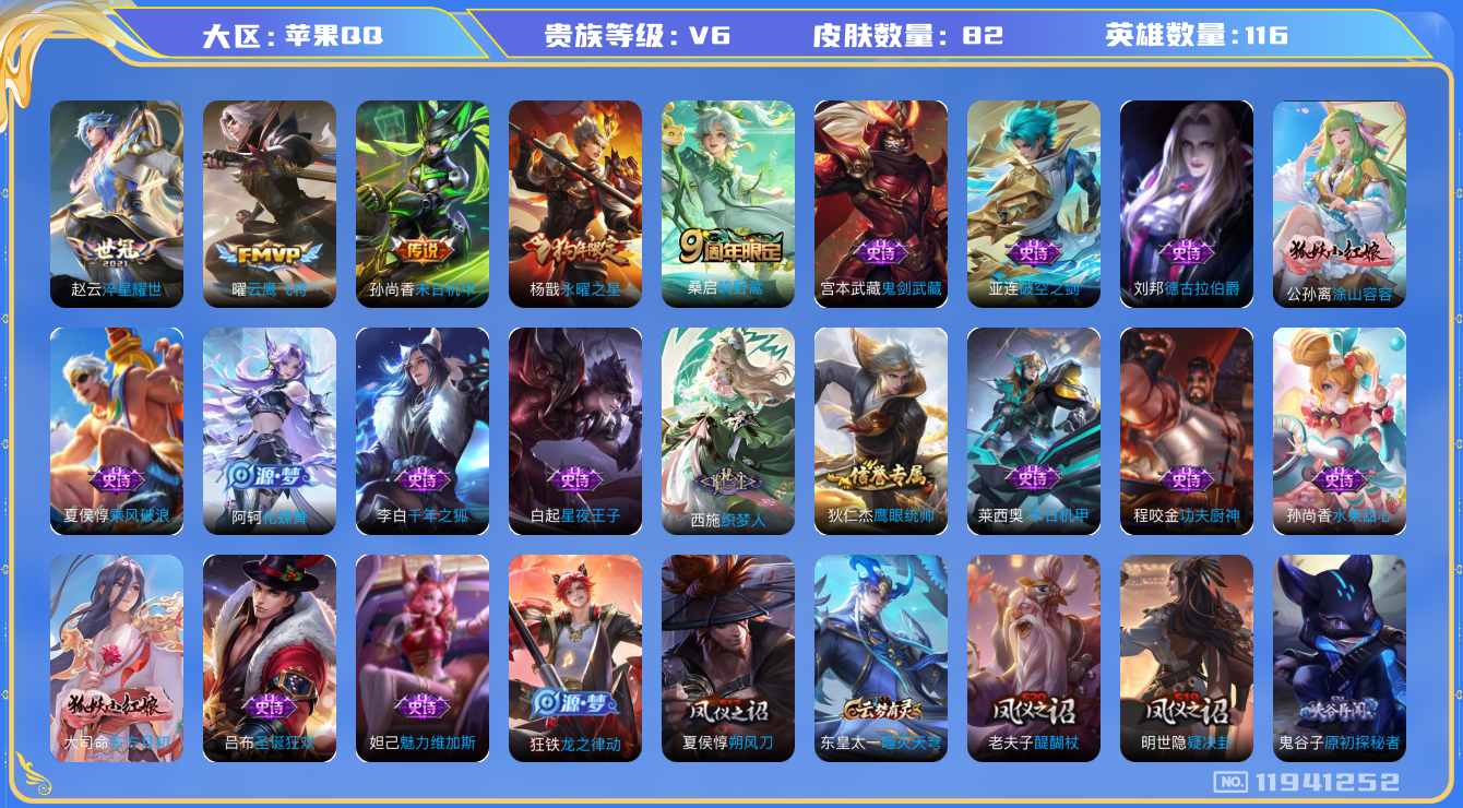 [11941252]V6 5传说 116英雄 82皮肤 可修改实名 优质装备:云鹰飞将(小将军),末日机甲-孙尚香(绿蚂蚱),淬星耀世,涂山容容 限定皮:鸣野蒿,永曜之星 史诗皮:化蝶舞,龙之律动,破空之剑,东方月初,织梦人,千年之狐,末日机甲-莱西奥,水果甜心,星夜王子,功夫厨神,德古拉伯爵,鬼剑武藏,乘风破浪,圣诞狂欢,鹰眼统帅,魅力维加斯