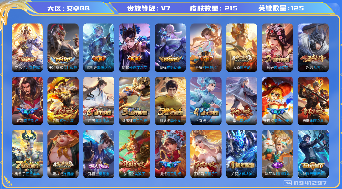 - [11135946]实名: 可修改 性别: 女号 贵族等级: V7 英雄数: 123 皮肤数: 210 传说皮: 末日机甲-孙尚香,地狱火,地狱之眼 限定皮: 遇见飞天,李小龙,游园惊梦,梁祝,神威,飞衡,太华,天狼征服者,天狼绘梦者,凤求凰,至尊宝,五谷丰年