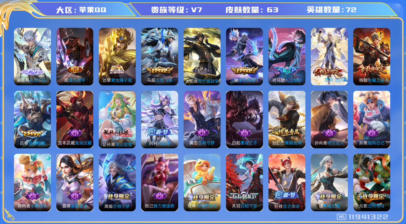 [11941322]V7 1无双 9传说 72英雄 63皮肤 可修改实名 优质装备:天机白泽,黄金狮子座,绛天战甲(鸡嘴战神),无双飞将,澜逐花归海,涂山容容 传说皮:死亡执政官,九山相柳 限定皮:愿照·山河定(司空震年限),怒海麟威,永曜之星 史诗皮:鸭鸭历险记-刘禅,化蝶舞,龙之律动,百相守梦-周瑜,百相守梦-黄忠,紫霞仙子,百相守梦(关羽),猫狗日记-孙策,时之恋人-孙尚香,水果甜心,星夜王子,鬼剑武藏,鹰眼统帅,魅力维加斯