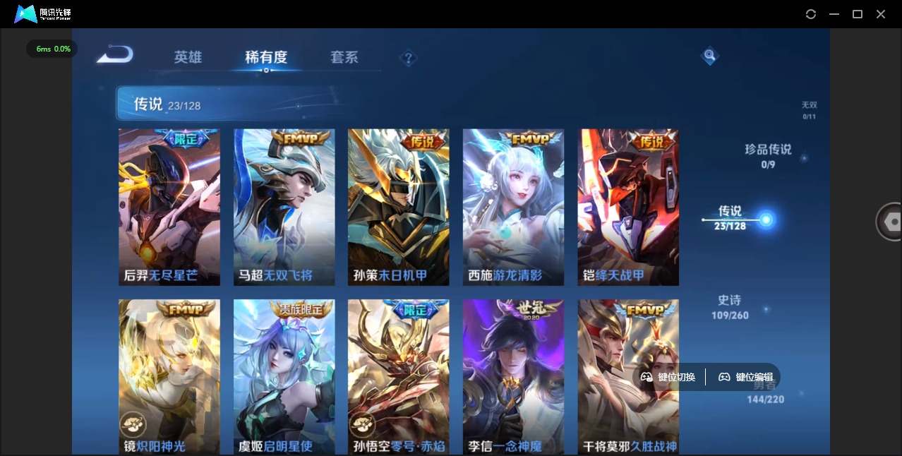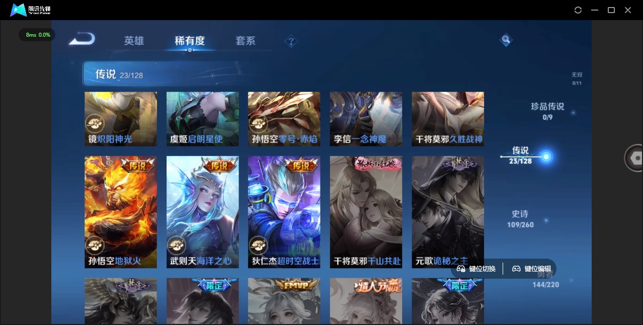 - PX_2074548-安卓Q 【可二次】 英雄数量:125 皮肤数量:282 贵族等级:贵族V8 [星传说 幽冥火 未来机甲】无双限定1 荣耀典藏1 传说品质18 史诗品质72器灵·螭龙剑 全息碎影 诗剑行 记忆之芯 云鹰飞将 无双飞将 零号赤焰 山海炽霜斩 幻光神枪 祥瑞亨通 愿照·九州拓 齐天大圣 久胜战神 末日机甲女 启明星使 地狱火 黄金狮子座 逐花归海 乘龙铭钟鼎 琥珀纪元马超 至尊宝