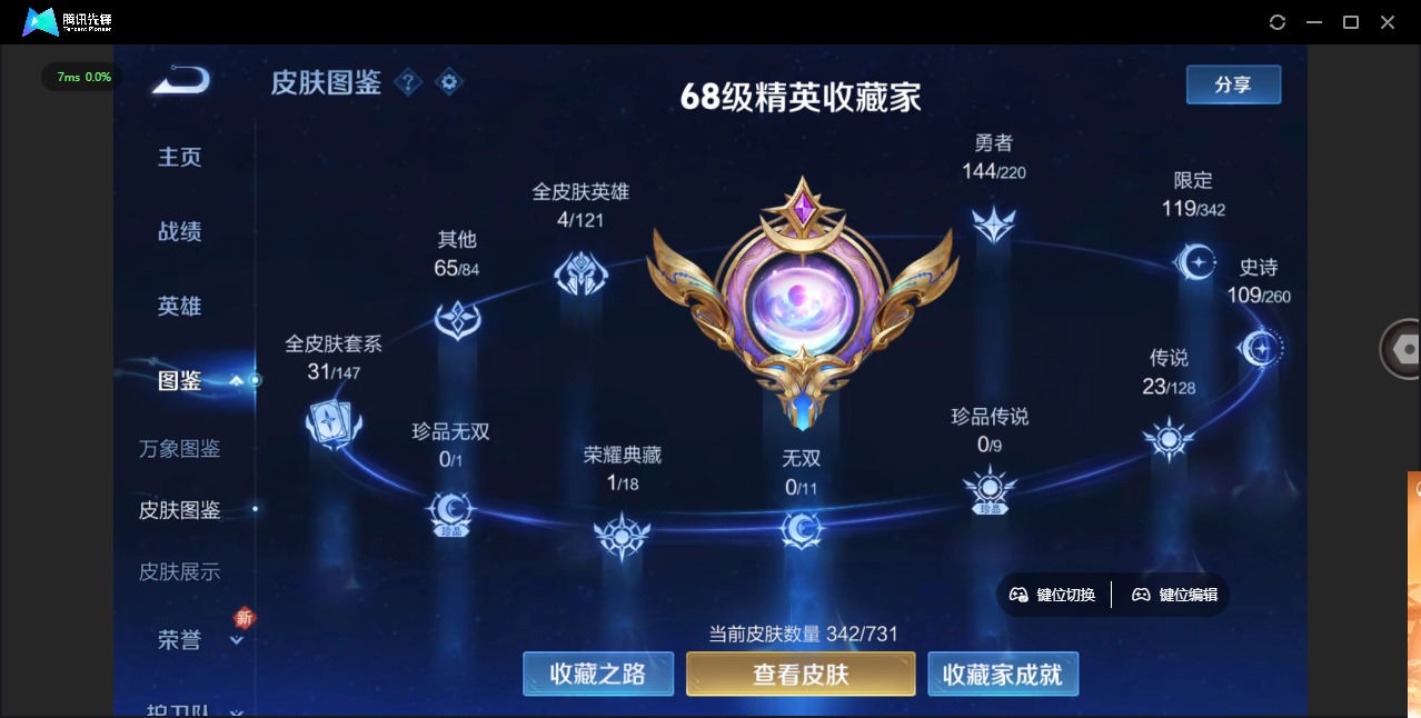 - [12289786]实名: 可修改 贵族等级: V10 英雄数: 125 皮肤数: 466 荣耀水晶: 鸣剑·曳影,全息碎影,九霄神辉 无双皮: 碎月剑心,韩信群星魔术团 珍品传说: 兔狲·蓬尾,酷洛米之心,大耳狗之梦,朽木白哉,黑崎一护 传说皮: 黄金狮子座,黄金射手座,绛天战甲,末日机甲-孙尚香,地狱火,仲夏夜之梦,零号·赤焰,时之恋人-刘备,淬星耀世,遇见胡旋,末日机甲-孙策,挚爱之约,挚爱花嫁,无双飞将,碎云,画中仙,妄想实况,艾琳觅芳踪,乘龙·问璇玑,落雪白狼,幻光神枪,祥瑞亨通,星之鸣奏,续相思,诡秘之主 限定皮: 冰锋战神,遇见飞天,李小龙,祈雪灵祝,游园惊梦,梁祝,时雨天司,引擎之心,魔法小厨娘,辉光之辰,异界灵契,天魔缭乱,神威,飞衡,天狼狩猎者,冰霜恋舞曲,逐梦之影,逐梦之光,神奇女侠,美猴王,白虎志,梅西,至尊宝,一生所爱,武陵仙君,如梦令-后羿,大圣娶亲,默契交锋-花木兰,霸王别姬-虞姬,高山流水,孙行者,猪悟能,寅虎·展翼,补天,百木心枪,玉兔公主,启示之音,匿光决锋者,无尽星芒,五谷丰年,神器·万象笔,山海·碧波行,齐天大圣,至美·化雀舞,至美·乘鲤谣,鸣野蒿,陌上桑,愿照·千秋盛,愿照·众生和,愿照·山河定,愿照·岁时盈,愿照·福禄聚,愿照·九州拓