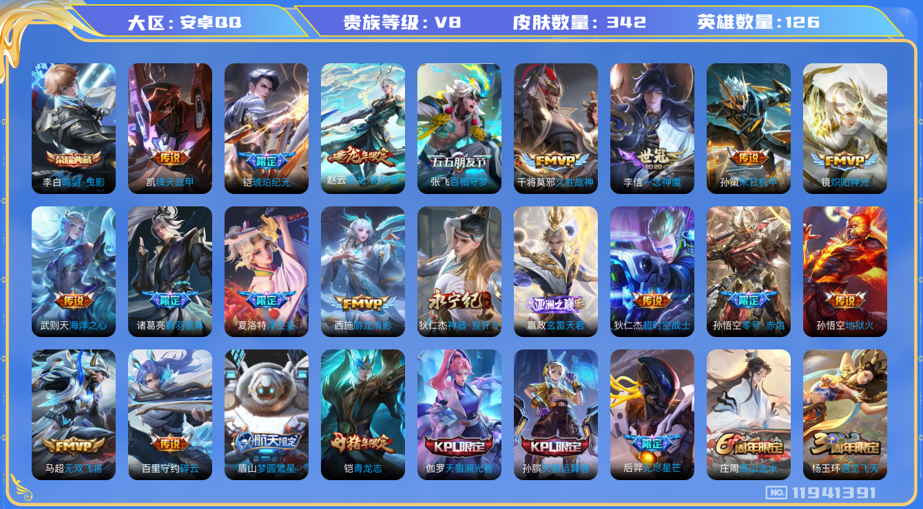 [11941391]V8 1典藏 23传说 126英雄 342皮肤 典藏英雄武则天 可修改实名 优质装备:鸣剑·曳影,绛天战甲(鸡嘴战神),久胜战神,炽阳神光,一念神魔,地狱火,零号·赤焰,海洋之心,游龙清影(小青龙),超时空战士-狄仁杰,末日机甲-孙策,无双飞将,碎云,神器·狴犴令,浮生妄,百相守梦(张飞),鹤羽星尊,琥珀纪元铠,玄雷天君 传说皮:乘龙·铭钟鼎(赵云年限) 珍宝阁皮:优雅恋人,女武神,玩趣恶龙 限定皮:鸣野蒿,遇见飞天,高山流水,齐天大圣,五谷丰年,青龙志(铠年限),天狼运算者,梁祝,天狼狩猎者,天狼溯光者,李小龙,孙行者,猪悟能,大圣娶亲,引擎之心,美猴王,无尽星芒,梦圆繁星,山海·玄木吟(马可年限) 史诗皮:龙之律动,石田雨龙,茶境仙,怒海争锋,破空之剑,埋骨钱,琥珀纪元伽罗,百相守梦-百里守约,紫霞仙子,苍穹之光,电玩小子(小书包),白龙吟,黄金分割率,特工魅影,千年之狐,江河有灵,魅语,百解令(蒙犽),高渐离燃音魔法,无限星赏官,匿光破解者,冰冠公主,偶像歌手,晚萤,电玩·爆裂旋风,百相守梦(刘备),暗夜猫娘,银翎春语,龙骑士(小龙虾),末日机甲-吕布,猫狗日记-孙策,猫狗日记-大乔,时之恋人-孙尚香,乱世虎臣,节奏热浪,修罗,女仆咖啡,摇滚巨星,水果甜心,绅士熊喵,天才门将,星夜王子,心灵骇客,功夫厨神,德古拉伯爵,暗隐猎兽者,幽灵船长,鬼剑武藏,暗渊魔法,心灵战警,舞动绿茵,地狱岩魂,纤云弄巧,繁星吟游(呼啦呼啦),拒霜思,缤纷独角兽,乘风破浪,逐浪之夏,月团寄思,水晶猎龙者,曙光守护者,箭羽风息,唤灵魅影,金属风暴,圣诞狂欢,圣诞恋歌,鹰眼统帅,王者之锤,暗夜贵公子,魅力维加斯,黎明之约,赏金猎手,无心,未来纪元-赵云