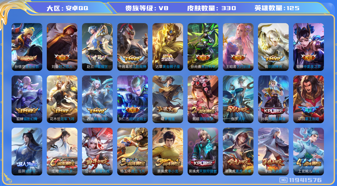 [11941576]V8 1典藏 19传说 125英雄 330皮肤 可修改实名 优质装备:全息碎影(猴子典藏),黄金狮子座,冠军飞将,猫影幻舞,久胜战神,炽阳神光,末日机甲-孙尚香(绿蚂蚱),仲夏夜之梦(大飞蛾),李逍遥,乞巧织情,时之恋人-刘备(电焊工),游龙清影(小青龙),淬星耀世,超时空战士-狄仁杰,涂山容容 珍宝阁皮:女武神,玩趣恶龙 限定皮:至尊宝,凤求凰(白切鸡),凤凰于飞,太华(伽罗年限),前尘镜,时之彼端,白晶晶,飞衡(韩信年限),遇见飞天,高山流水,五谷丰年,天狼运算者,游园惊梦,梁祝,天狼狩猎者,祈雪灵祝(雪兔子),李小龙,逐梦之影,如梦令-后羿,霸王别姬-项羽,孙行者,猪悟能,大圣娶亲,寅虎·赤拳(老虎年限) 史诗皮:化蝶舞,百相守梦-黄忠,紫霞仙子,苍穹之光,电玩小子(小书包),黄金分割率,特工魅影,千年之狐,永昼,魅语,高渐离燃音魔法,无限星赏官,冰冠公主,偶像歌手,晚萤,百相守梦(刘备),暗夜猫娘,龙骑士(小龙虾),末日机甲-吕布,猫狗日记-孙策,乱世虎臣,节奏热浪,修罗,女仆咖啡,摇滚巨星,水果甜心,绅士熊喵,天才门将,星夜王子,心灵骇客,时之奇旅-安琪拉,功夫厨神,德古拉伯爵,暗隐猎兽者,幽灵船长,鬼剑武藏,暗渊魔法,心灵战警,天秀·启明,舞动绿茵,地狱岩魂,纤云弄巧,繁星吟游(呼啦呼啦),拒霜思,缤纷独角兽,乘风破浪,逐浪之夏,龙鼓争鸣,水晶猎龙者,曙光守护者,热力回旋,箭羽风息,金属风暴,原初追逐者,圣诞狂欢,圣诞恋歌,鹰眼统帅,王者之锤,暗夜贵公子,魅力维加斯,黎明之约,无心,未来纪元-赵云