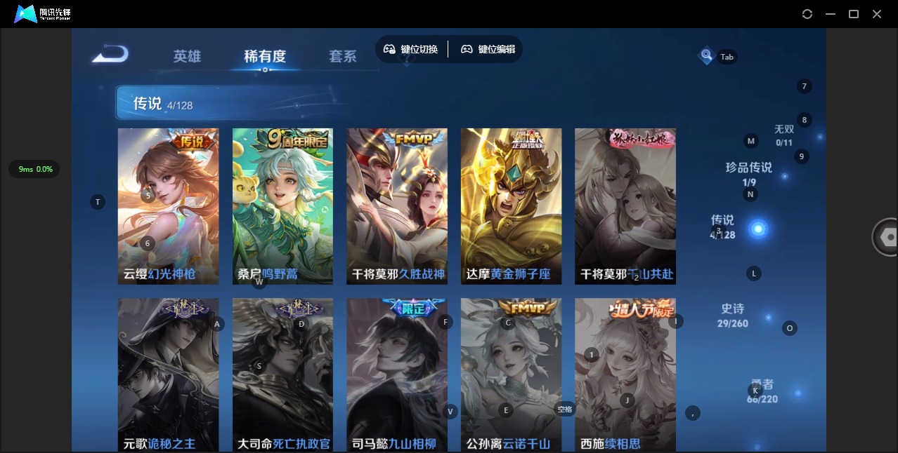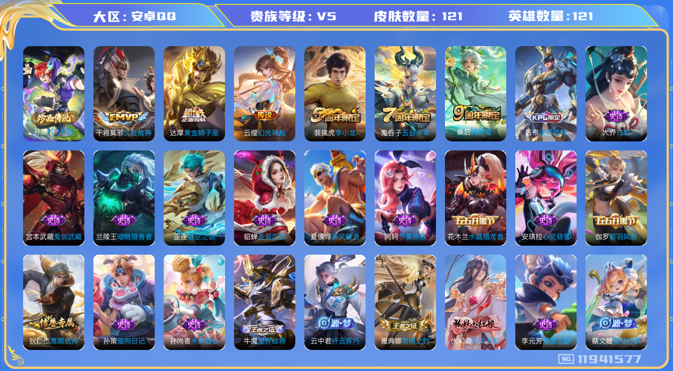 [11941577]V5 1珍品传说 4传说 121英雄 121皮肤 可修改实名 优质装备:黄金狮子座,久胜战神 珍品传说:时之奇旅-孙策 传说皮:幻光神枪 珍宝阁皮:玩趣恶龙 限定皮:逐霄战戟,鸣野蒿,五谷丰年,李小龙 史诗皮:星界战将,破空之剑,东方月初,白蛇,猫狗日记-孙策,节奏热浪,女仆咖啡,水果甜心,绅士熊喵,心灵骇客,暗隐猎兽者,鬼剑武藏,纤云弄巧,繁星吟游(呼啦呼啦),乘风破浪,逐浪之夏,水晶猎龙者,箭羽风息,圣诞恋歌,鹰眼统帅,魅力维加斯,黎明之约,赏金猎手,无心