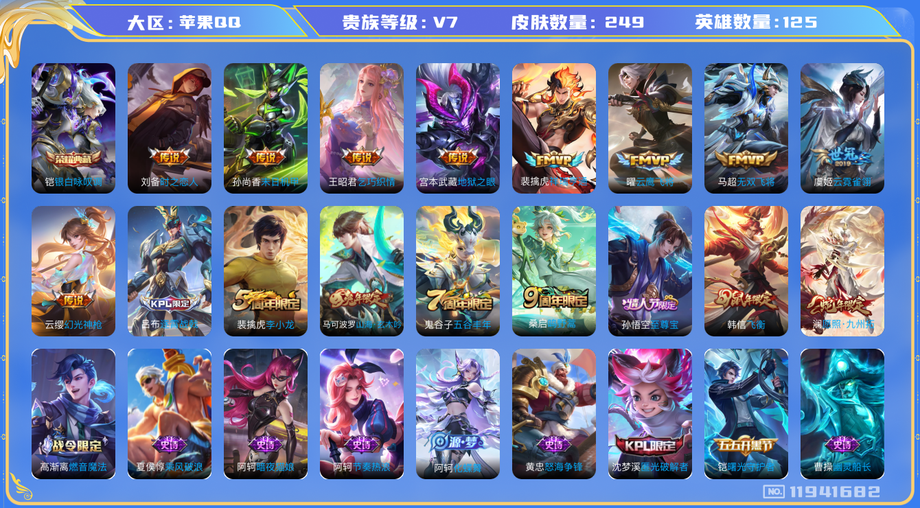 [11941682]V7 1典藏 11传说 125英雄 249皮肤 可修改实名 优质装备:银白咏叹调(倪克斯侍卫),云鹰飞将(小将军),云霓雀翎,末日机甲-孙尚香(绿蚂蚱),地狱之眼,乞巧织情,时之恋人-刘备(电焊工),无双飞将 传说皮:祥瑞亨通,幻光神枪 珍宝阁皮:妄想食味,优雅恋人 限定皮:愿照·九州拓(澜年限),逐霄战戟,鸣野蒿,至尊宝,飞衡(韩信年限),五谷丰年,李小龙,山海·玄木吟(马可年限) 史诗皮:鸭鸭历险记-刘禅,器灵·浮梦炉,化蝶舞,龙之律动,雪豹·霜爪,石田雨龙,茶境仙,怒海争锋,破空之剑,琥珀纪元伽罗,上官婉儿群星魔术团,蔬乡物语(鲁班七号),紫霞仙子,黄金分割率,特工魅影,千年之狐,永昼,江河有灵,百解令(蒙犽),高渐离燃音魔法,蒙恬荣光圣徽,匿光破解者,青蛇,偶像歌手,晚萤,电玩·爆裂旋风,暗夜猫娘,末日机甲-吕布,乱世虎臣,节奏热浪,修罗,女仆咖啡,摇滚巨星,水果甜心,天才门将,星夜王子,功夫厨神,暗隐猎兽者,幽灵船长,鬼剑武藏,暗渊魔法,心灵战警,乐园奇幻夜,天秀·启明,舞动绿茵,地狱岩魂,诗语江南,纤云弄巧,拒霜思,乘风破浪,水晶猎龙者,曙光守护者,箭羽风息,金属风暴,原初追逐者,圣诞狂欢,圣诞恋歌,鹰眼统帅,魅力维加斯,赏金猎手,无心,未来纪元-赵云