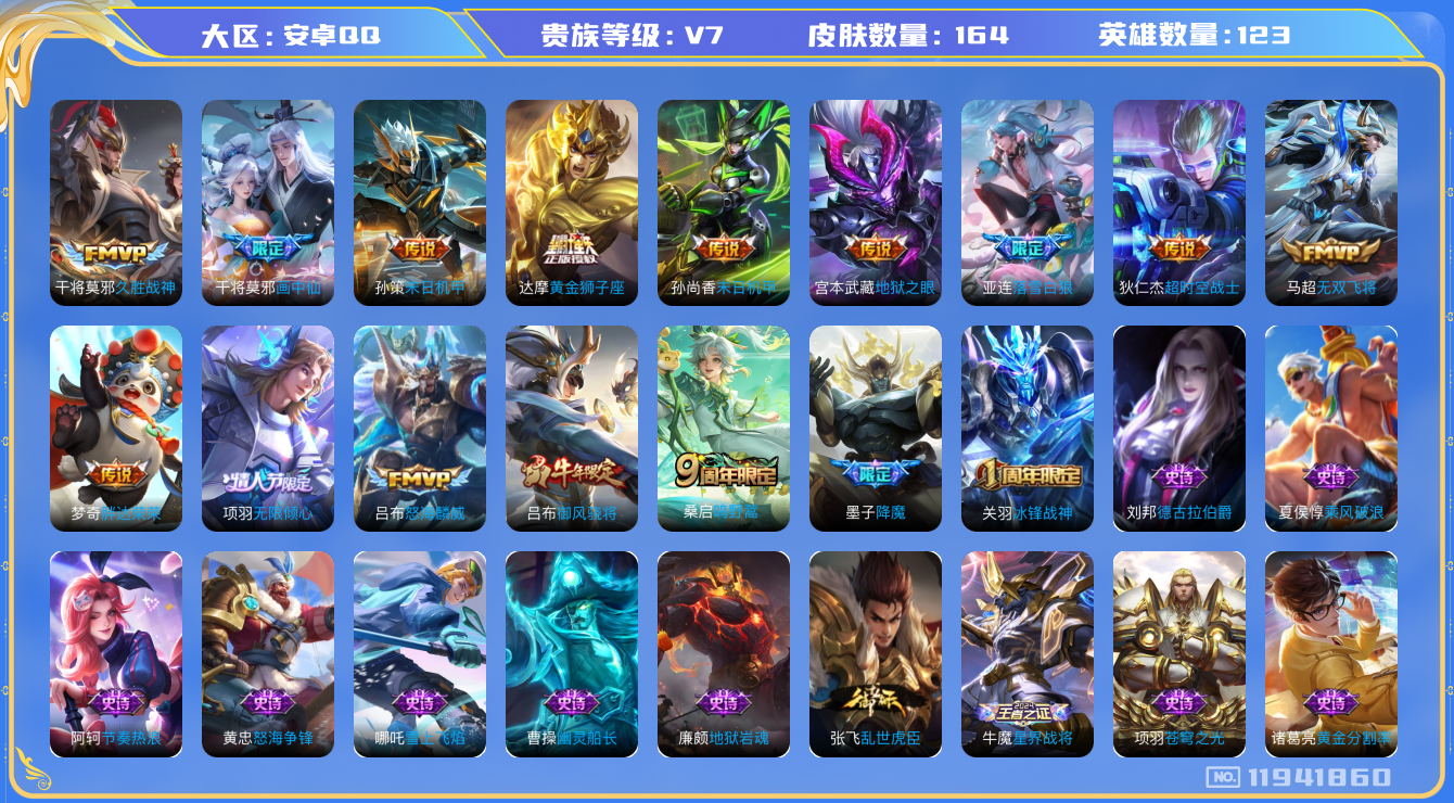 [11941860]V7 13传说 123英雄 164皮肤 可修改实名 优质装备:黄金狮子座,久胜战神,末日机甲-孙尚香(绿蚂蚱),地狱之眼,胖达荣荣,超时空战士-狄仁杰,末日机甲-孙策,无双飞将,画中仙 传说皮:落雪白狼 珍宝阁皮:妄想食味,胡桃夹子 限定皮:鸣野蒿,无限倾心-项羽,怒海麟威,降魔,冰锋战神,御风骁将(吕布年限) 史诗皮:星界战将,怒海争锋,苍穹之光,黄金分割率,特工魅影,永昼,蒙恬荣光圣徽,偶像歌手,电玩·爆裂旋风,乱世虎臣,节奏热浪,摇滚巨星,天才门将,星夜王子,功夫厨神,德古拉伯爵,幽灵船长,鬼剑武藏,地狱岩魂,乘风破浪,逐浪之夏,水晶猎龙者,金属风暴,原初追逐者,鹰眼统帅,魅力维加斯,黎明之约,雪上飞焰,无心,未来纪元-赵云