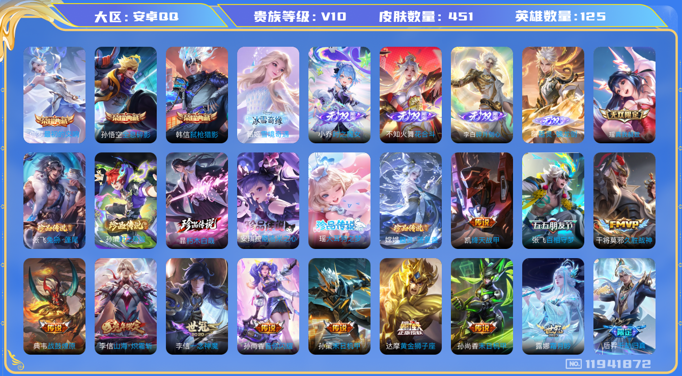 [11941872]V10 3典藏 6无双 6珍品传说 48传说 125英雄 451皮肤 可修改实名 优质装备:全息碎影(猴子典藏),弑枪猎影(韩信典藏),真我赫兹(瑶)(瑶无双),碎月剑心(李白无双),小乔时之魔女(小乔无双),花合斗,雪境奇遇-甄姬,器灵·螭龙剑,最初的交响(伽罗典藏),器灵·落星盏,酷洛米之心,大耳狗之梦,朽木白哉,黄金狮子座,云鹰飞将(小将军),绛天战甲(鸡嘴战神),黄金白羊座,猫影幻舞,久胜战神,炽阳神光,一念神魔,末日机甲-孙尚香(绿蚂蚱),地狱火,仲夏夜之梦(大飞蛾),零号·赤焰,地狱之眼,胖达荣荣,游龙清影(小青龙),末日机甲-孙策,音你闪耀(rap皮),碎云,山海·炽霜斩(李信年限),浮生妄,记忆之芯(机甲兔),百相守梦(张飞),夜礼服假面,霜月吟,澜逐花归海,艾琳觅芳踪,千劫归真,涂山容容 珍品传说:时之奇旅-孙策,兔狲·蓬尾 传说皮:典韦战鼓燎原,云诺千山,续相思,星之鸣奏,祥瑞亨通,幻光神枪 珍宝阁皮:妄想食味,胡桃夹子,蔷薇恋人 限定皮:愿照·九州拓(澜年限),愿照·福禄聚(蔡文姬年限),愿照·岁时盈(虞姬年限),愿照·山河定(司空震年限),愿照·众生和(妲己年限),愿照·千秋盛(女娲年限),逐霄战戟,鸣野蒿,至尊宝,白虎志(电光耗子),绯月行,时雨天司(水龙头),神威(电光马子),飞衡(韩信年限),山海·碧波行(瑶年限),至美·乘鲤谣,齐天大圣,怒海麟威,五谷丰年,冰锋战神,游园惊梦,虎魄,祈雪灵祝(雪兔子),李小龙,如梦令-后羿,默契交锋-兰陵王,孙行者,猪悟能,大圣娶亲,引擎之心,蜜橘之夏,美猴王,百木心枪,玉兔公主,山海·玄木吟(马可年限),冰霜神祇 史诗皮:鸭鸭历险记-刘禅,飞车小橘子,苍鳞隐世,器灵·浮梦炉,糖绘人间,狼魂孤将,瑰影绮梦,化蝶舞,灵蛊蚀心,星界战将,龙之律动,雪豹·霜爪,藏狐·褐绒,布丁狗之誓,小牛鸭,石田雨龙,百相守梦-周瑜,茶境仙,怒海争锋,破空之剑,战舞者,琥珀纪元伽罗,蔬乡物语(鲁班七号),百相守梦-百里守约,百相守梦-黄忠,织梦人,紫霞仙子,苍穹之光,电玩小子(小书包),黄金分割率,特工魅影,千年之狐,江河有灵,匿光侦查者,浮梦罗烟,完美假期,魅语,百解令(蒙犽),高渐离燃音魔法,蒙恬荣光圣徽,无限星赏官,匿光破解者,冰冠公主,青蛇,偶像歌手,白蛇,晚萤,暗夜猫娘,龙骑士(小龙虾),末日机甲-吕布,猫狗