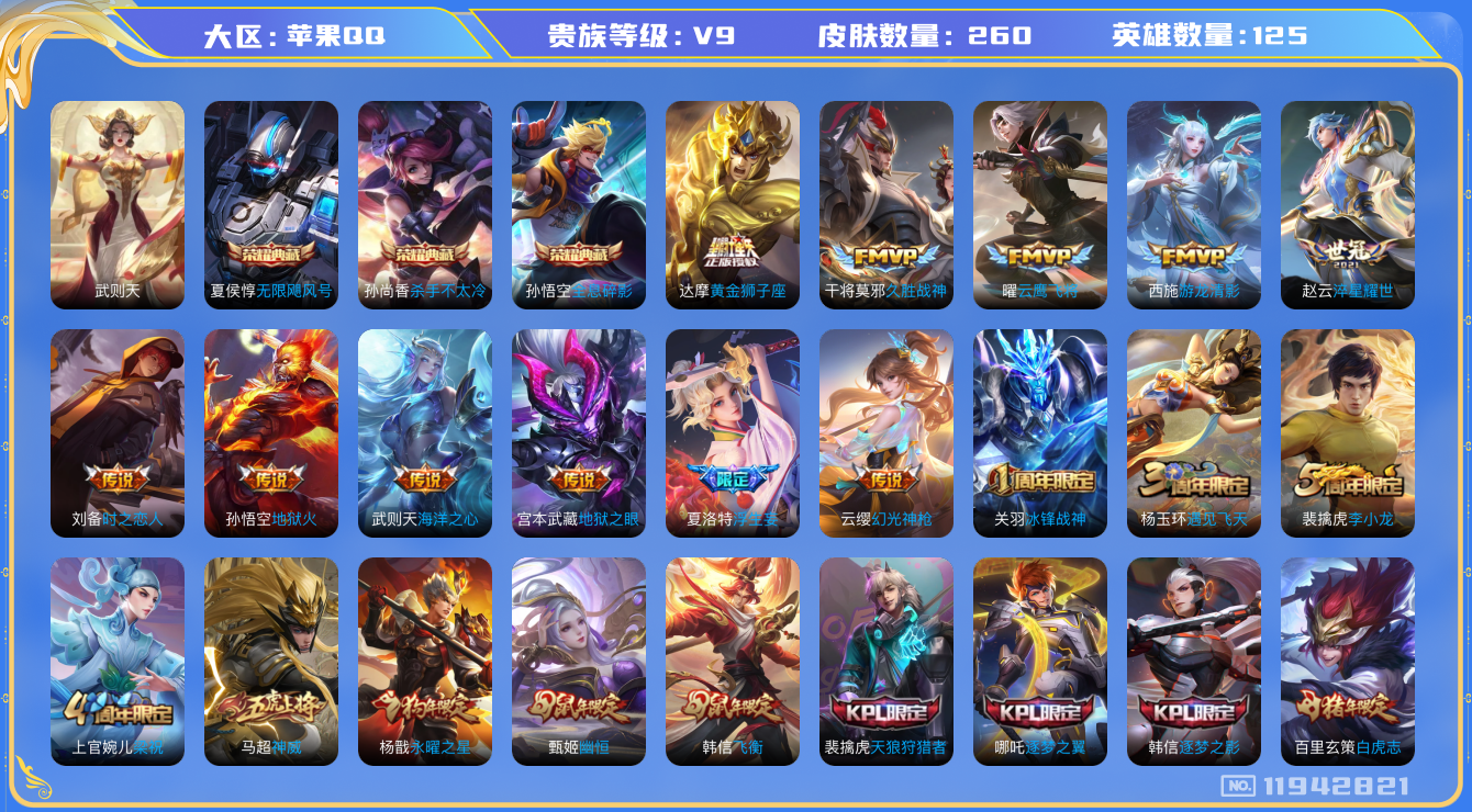 - [11285083]V10 3典藏 2无双 1珍品传说 35传说 126英雄 438皮肤 典藏英雄武则天 可修改实名 荣耀水晶:鸣剑·曳影,全息碎影(猴子典藏),无限飓风号(高达) 无双皮:器灵·螭龙剑,碎月剑心(李白无双) 珍品传说:器灵·落星盏 传说皮:云诺千山,祥瑞亨通,遇见胡旋,游龙清影(小青龙),黄金射手座,地狱火,仲夏夜之梦(大飞蛾),海洋之心,末日机甲-孙尚香(绿蚂蚱),云霓雀翎,一念神魔,冠军飞将,久胜战神,云鹰飞将(小将军),炽阳神光,无双飞将,音你心动-小乔,音你心动-周瑜,胖达荣荣,时之恋人-刘备(电焊工),末日机甲-孙策,艾琳觅芳踪 珍宝阁皮:万物之道,优雅恋人,蔷薇恋人 限定皮:愿照·九州拓(澜年限),愿照·山河定(司空震年限),愿照·众生和(妲己年限),鸣野蒿,至尊宝,凤求凰(白切鸡),太华(伽罗年限),异界灵契(白毛香),傲雪梅枪,寅虎·展翼(孙膑年限),时雨天司(水龙头),神威(电光马子),山海·碧波行(瑶年限),遇见飞天,高山流水,诗剑行,五谷丰年,青龙志(铠年限),武圣,游园惊梦,梁祝,虎魄,朱雀志(守约年限),辉光之辰,真爱至上,孙行者,大圣娶亲,引擎之心,青春决赛季,冰霜恋舞曲,美猴王,寅虎·御盾(廉颇年限),寅虎·瑞焰(虎皮蛋子),寅虎·心曲(虎婆),启示之音 史诗皮:赞萌露比,星界战将,茶境仙,苍鳞隐世,器灵·浮梦炉,鸭鸭历险记-刘禅,灵蛊蚀心,龙之律动,决胜骁骑,蔬乡物语(鲁班七号),琥珀纪元伽罗,化蝶舞,破空之剑,遇见神鹿,紫霞仙子,苍穹之光,电玩小子(小书包),黄金分割率,特工魅影,千年之狐,永昼,江河有灵,高渐离燃音魔法,百解令(蒙犽),蒙恬荣光圣徽,冰冠公主,青蛇,偶像歌手,晚萤,无限星赏官,魅语,白蛇,暗夜猫娘,龙骑士(小龙虾),末日机甲-吕布,猫狗日记-孙策,猫狗日记-大乔,时之恋人-孙尚香,乱世虎臣,节奏热浪,修罗,女仆咖啡,摇滚巨星,水果甜心,绅士熊喵,天才门将,星夜王子,心灵骇客,时之奇旅-安琪拉,功夫厨神,德古拉伯爵,暗隐猎兽者,幽灵船长,鬼剑武藏,暗渊魔法,心灵战警,乐园奇幻夜,天秀·启明,舞动绿茵,地狱岩魂,诗语江南,纤云弄巧,繁星吟游(呼啦呼啦),拒霜思,缤纷独角兽,乘风破浪,逐浪之夏,龙鼓争鸣,月团寄思,水晶猎龙者,曙光守护者,热力回旋,箭羽风息,金属风暴,原初追逐者,圣诞狂欢,圣诞恋歌,鹰眼统帅,王者之锤,暗夜