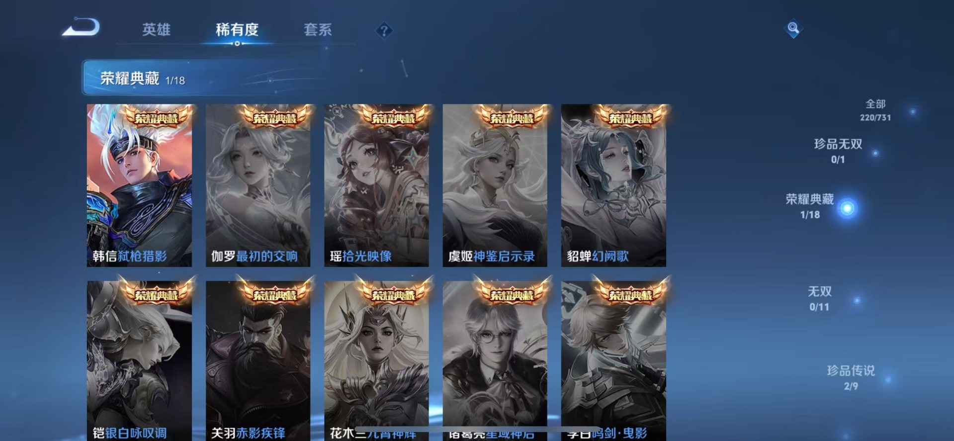 大乔猫狗日记,刘邦德古拉伯爵,夏侯惇乘风破浪,阿轲暗夜猫娘,铠曙光守护者,曹操幽灵船长,廉颇地狱岩魂,伽罗箭羽风息,孙尚香时之恋人,孙策猫狗日记,赵怀真器灵·浮梦炉,司马懿暗渊魔法,宫本武藏鬼剑武藏,兰陵王暗隐猎兽者,貂蝉圣诞恋歌,花木兰水晶猎龙者,李白千年之狐,安琪拉心灵骇客,白起星夜王子,嬴政摇滚巨星,程咬金功夫厨神,雅典娜冰冠公主,雅典娜黎明之约,韩信白龙吟,百里守约特工魅影,李元芳逐浪之夏,墨子金属风暴,蔡文姬舞动绿茵,橘右京修罗