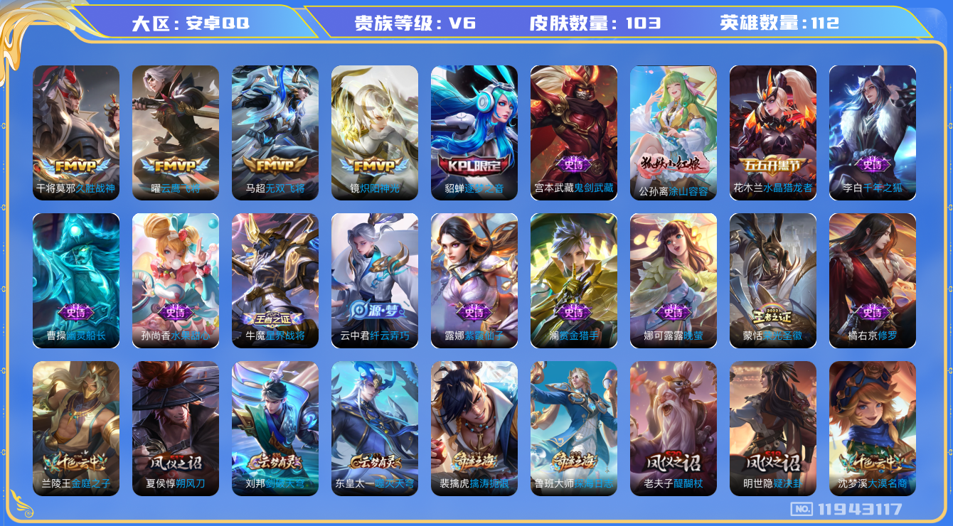 [11943117]V6 4传说 112英雄 103皮肤 可修改实名 优质装备:云鹰飞将(小将军),久胜战神,炽阳神光,无双飞将,涂山容容 限定皮:逐梦之音 史诗皮:星界战将,紫霞仙子,千年之狐,蒙恬荣光圣徽,晚萤,修罗,水果甜心,幽灵船长,鬼剑武藏,纤云弄巧,水晶猎龙者,赏金猎手