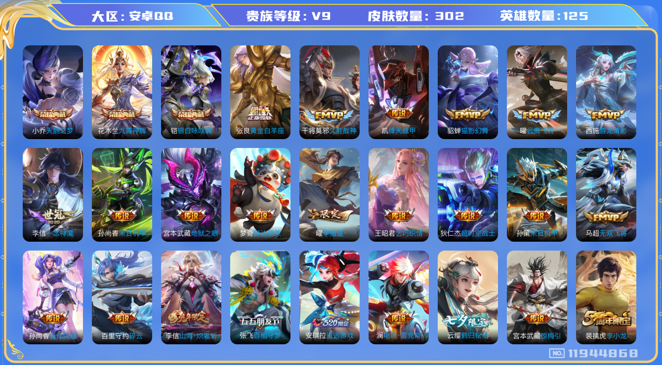 - [11252467]V10 3典藏 5无双 8珍品传说 65传说 125英雄 448皮肤 可修改实名 优质装备:星域神启(倪克斯贼亮),九霄神辉(木兰典藏),青丘·九尾(妲己无双),小乔时之魔女(小乔无双),雪境奇遇-甄姬,器灵·螭龙剑,最初的交响(伽罗典藏),天机白泽,江户川柯南,怪盗基德,器灵·落星盏,酷洛米之心,大耳狗之梦,黑崎一护,黄金狮子座,黄金射手座,云鹰飞将(小将军),绛天战甲(鸡嘴战神),黄金白羊座,猫影幻舞,久胜战神,炽阳神光,一念神魔,云霓雀翎,仲夏夜之梦(大飞蛾),零号·赤焰,地狱之眼,音你心动-周瑜,胖达荣荣,乞巧织情,时之恋人-刘备(电焊工),游龙清影(小青龙),淬星耀世,超时空战士-狄仁杰,末日机甲-孙策,花朝如约(花篮子),音你闪耀(rap皮),天秀幻梦,山海·炽霜斩(李信年限),炽翼辉光(娃娃菜牛角包),画中仙,浮生妄,记忆之芯(机甲兔),青丘·九尾,百相守梦(张飞),电玩·雷克斯,鹤羽星尊,灼幽烈阳,妄想奇谈,惊梅引,小动物乐团,霜月吟,澜逐花归海,艾琳觅芳踪,牧神诗旅,玄雷天君,千劫归真 珍品传说:时之奇旅-孙策,兔狲·蓬尾 传说皮:典韦战鼓燎原,死亡执政官,九山相柳,云诺千山,续相思,星之鸣奏,祥瑞亨通,幻光神枪 珍宝阁皮:万物之道,蔷薇恋人 限定皮:愿照·九州拓(澜年限),愿照·福禄聚(蔡文姬年限),愿照·岁时盈(虞姬年限),愿照·山河定(司空震年限),愿照·众生和(妲己年限),愿照·千秋盛(女娲年限),逐霄战戟,鸣野蒿,至尊宝,凤求凰(白切鸡),凤凰于飞,异界灵契(白毛香),傲雪梅枪,寅虎·展翼(孙膑年限),时雨天司(水龙头),神威(电光马子),飞衡(韩信年限),遇见飞天,高山流水,怒海麟威,降魔,五谷丰年,青龙志(铠年限),冰锋战神,梁祝,烈魂,祈雪灵祝(雪兔子),李小龙,玄武志(苏烈年限),朱雀志(守约年限),大圣娶亲,青春决赛季,女儿国国王,寅虎·御盾(廉颇年限),寅虎·瑞焰(虎皮蛋子),寅虎·心曲(虎婆),寅虎·赤拳(老虎年限),时之祈愿-瑶(瑶传限),山海·玄木吟(马可年限),冰霜神祇 史诗皮:鸭鸭历险记-刘禅,飞车小橘子,苍鳞隐世,器灵·浮梦炉,糖绘人间,狼魂孤将,化蝶舞,灵蛊蚀心,龙之律动,雪豹·霜爪,藏狐·褐绒,布丁狗之誓,石田雨龙,茶境仙,幻珠鲛人,怒海争锋,夜落电台,奇遇星旅,百相守梦-百里守约,守夜人,百相守梦-黄忠,