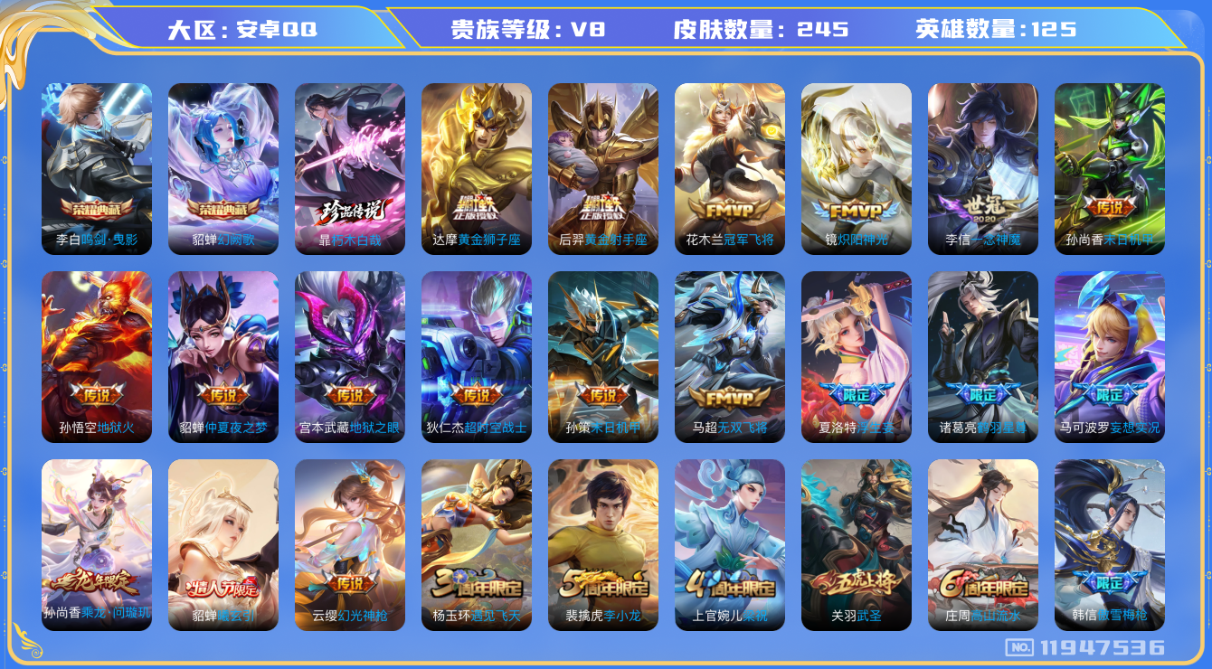 [11947536]【商品标题】:安卓Q-V8-至尊星耀I段位-125英雄-245皮肤-2典藏-0珍品无双-0无双-1珍品传说-23传说-62史诗