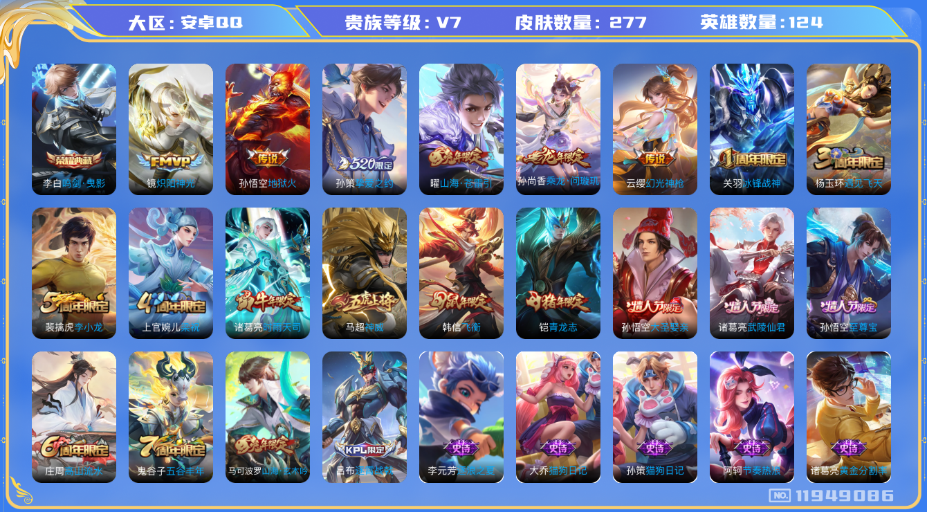[11949086]【商品标题】:安卓Q-V7-最强王者段位-124英雄-277皮肤-1典藏-0珍品无双-0无双-0珍品传说-8传说-72史诗