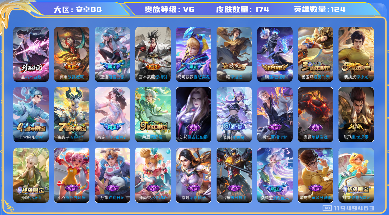 [11949463]V6 1珍品传说 7传说 124英雄 174皮肤 可修改实名 优质装备:朽木白哉,李逍遥,妄想实况,惊梅引,澜逐花归海 传说皮:典韦战鼓燎原,落雪白狼 珍宝阁皮:妄想食味,胡桃夹子 限定皮:鸣野蒿,至美·乘鲤谣,遇见飞天,五谷丰年,梁祝,李小龙 史诗皮:赞萌露比,茶境仙,化蝶舞,鸭鸭历险记-刘禅,龙之律动,幻珠鲛人,百相守梦-黄忠,紫霞仙子,黄金分割率,末日机甲-吕布,猫狗日记-孙策,乱世虎臣,女仆咖啡,摇滚巨星,水果甜心,星夜王子,德古拉伯爵,鬼剑武藏,心灵战警,天秀·启明,地狱岩魂,缤纷独角兽,逐浪之夏,金属风暴,原初追逐者,圣诞恋歌,鹰眼统帅,魅力维加斯,无心