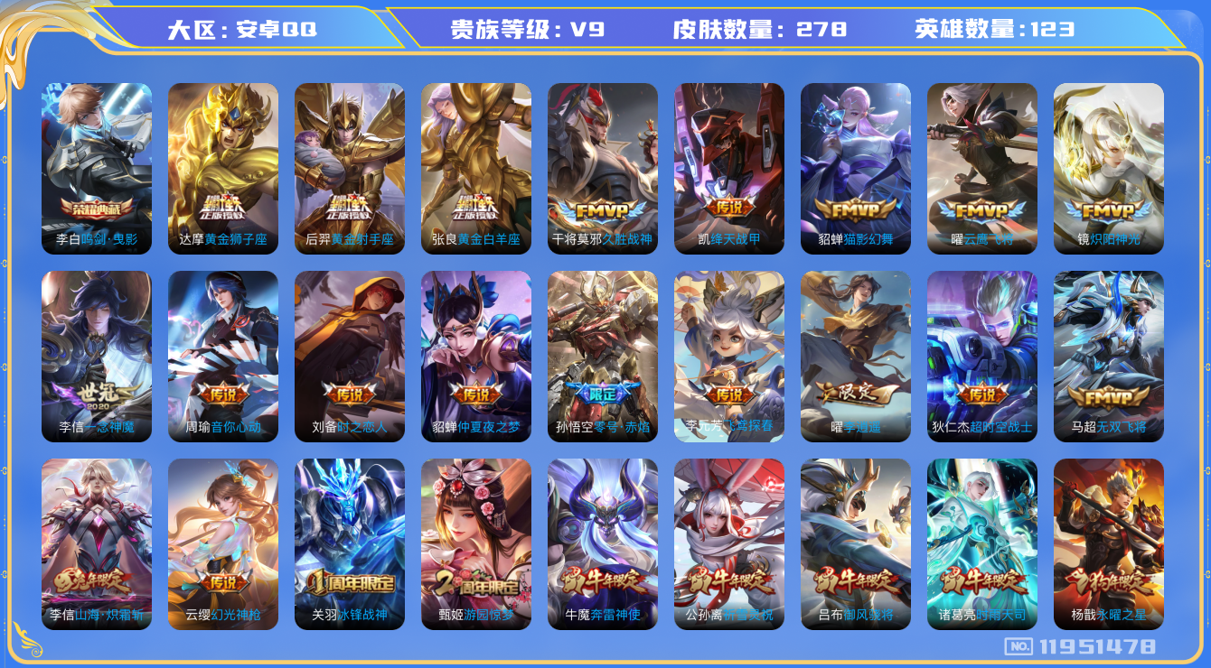 [11951478]【商品标题】:安卓Q-V9-永恒钻石II段位-123英雄-278皮肤-1典藏-0珍品无双-0无双-0珍品传说-28传说-85史诗