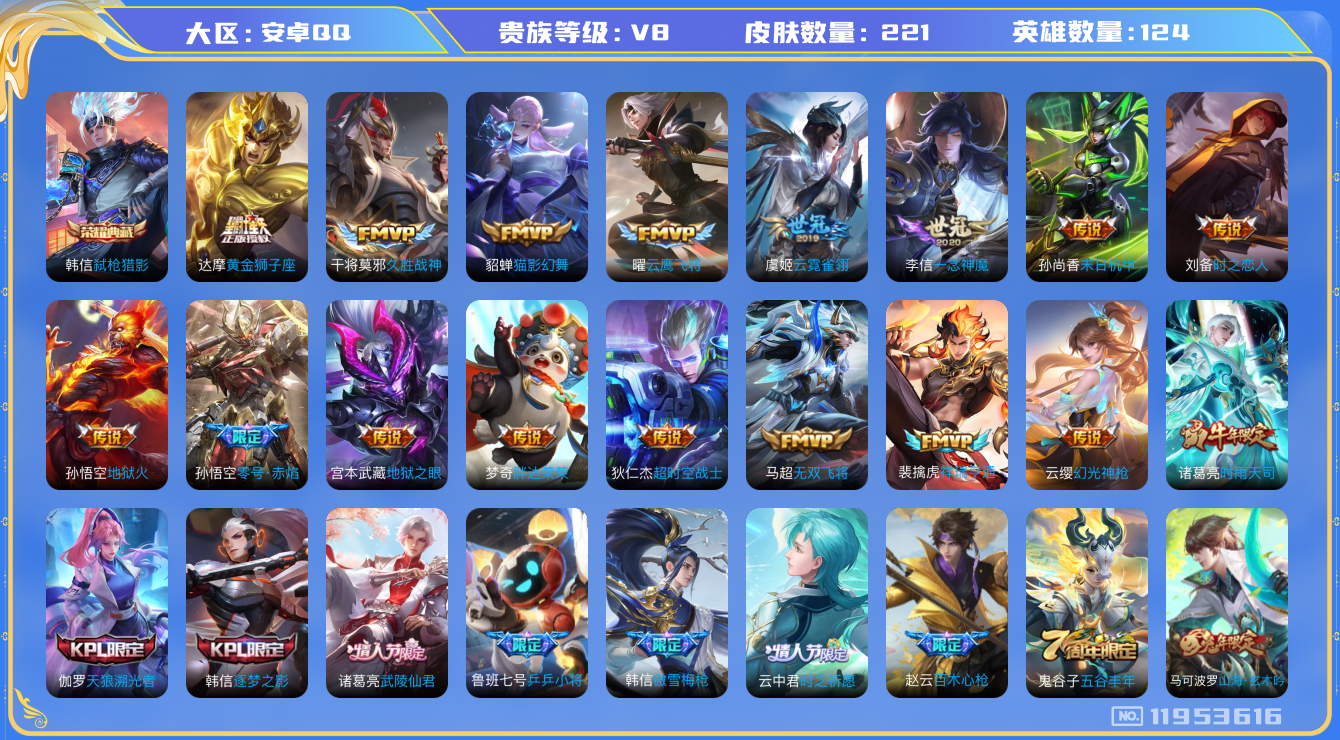 [11953616]【商品标题】:安卓Q-V8-永恒钻石I段位-124英雄-221皮肤-1典藏-0珍品无双-0无双-0珍品传说-23传说-66史诗