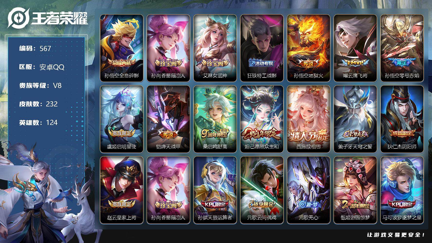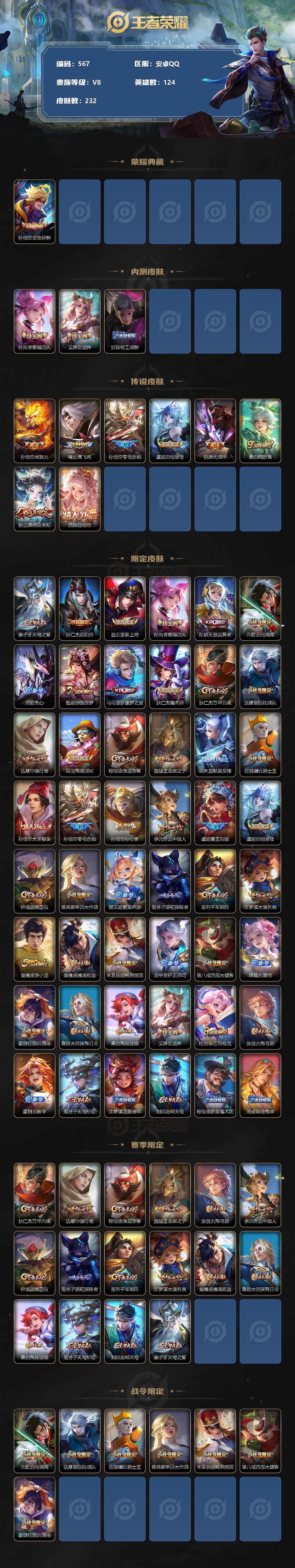 [11954666]【商品标题】:安卓Q-V8-永恒钻石III段位-124英雄-232皮肤-1典藏-0珍品无双-0无双-0珍品传说-8传说-54史诗