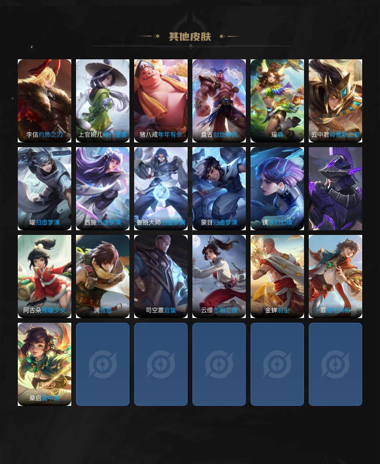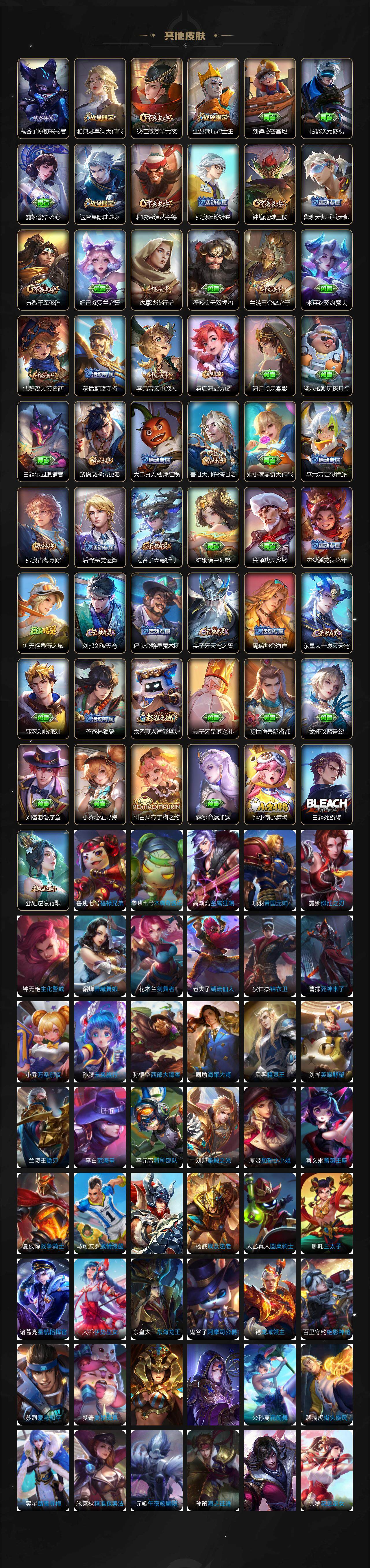 【赛季限定】:狄仁杰万华元夜,达摩沙漠行僧,程咬金演武夺筹,兰陵王金庭之子,张良古海寻踪,李元芳云中旅人,钟馗驱傩正仪,鬼谷子原初探秘者,苏烈千军破阵,沈梦溪大漠名商,裴擒虎擒涛扼浪,鲁班大师探海日志,桑启海盐诗旅,鬼谷子天穹祈灯,刘邦剑破天穹,姜子牙天穹之誓