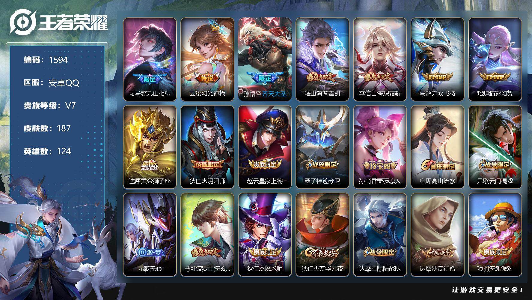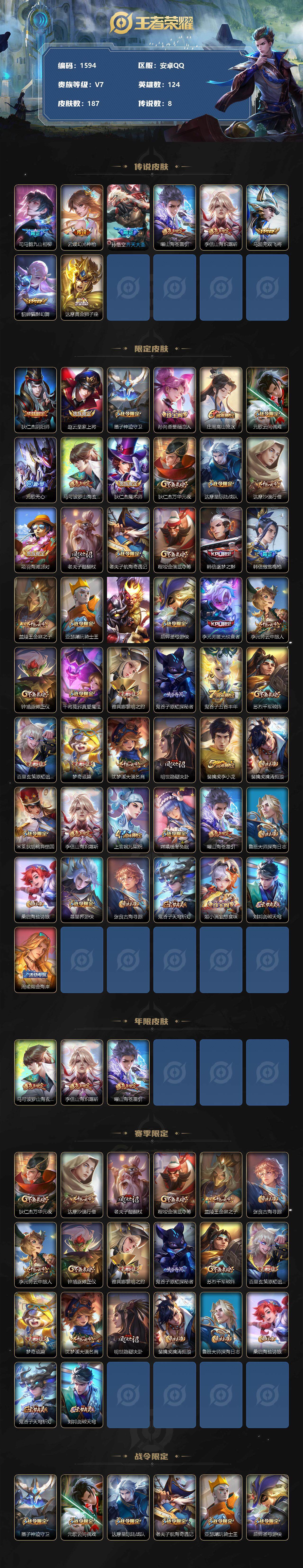 [11956035]【商品标题】:安卓Q-V7-最强王者段位-124英雄-187皮肤-0典藏-0珍品无双-0无双-0珍品传说-8传说-50史诗