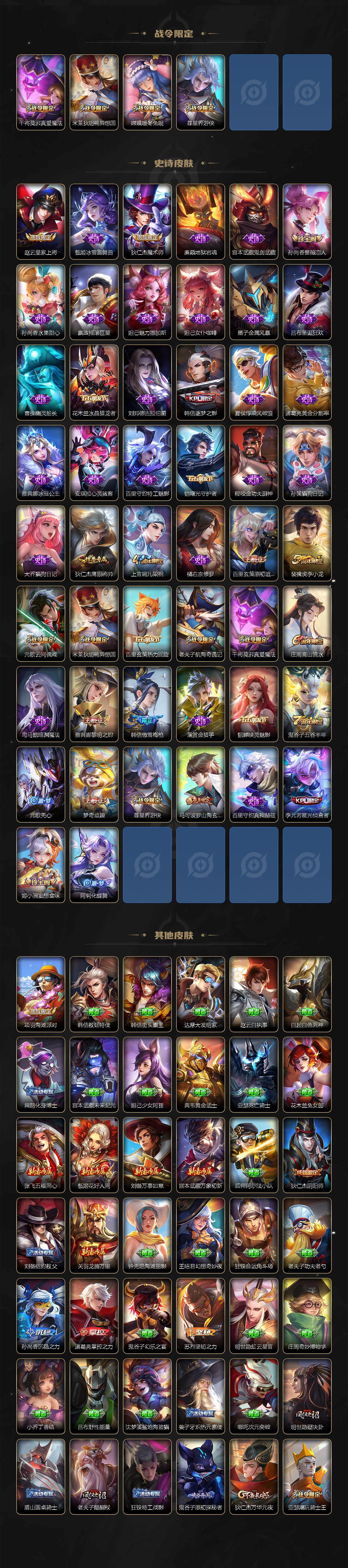 【史诗皮肤】:赵云皇家上将,甄姬冰雪圆舞曲,狄仁杰魔术师,廉颇地狱岩魂,宫本武藏鬼剑武藏,孙尚香蔷薇恋人,孙尚香水果甜心,嬴政摇滚巨星,妲己魅力维加斯,妲己女仆咖啡,墨子金属风暴,吕布圣诞狂欢,曹操幽灵船长,花木兰水晶猎龙者,刘邦德古拉伯爵,韩信逐梦之影,夏侯惇乘风破浪,诸葛亮黄金分割率,雅典娜冰冠公主,安琪拉心灵骇客,百里守约特工魅影,铠曙光守护者,程咬金功夫厨神,孙策猫狗日记,大乔猫狗日记,狄仁杰鹰眼统帅,上官婉儿梁祝,橘右