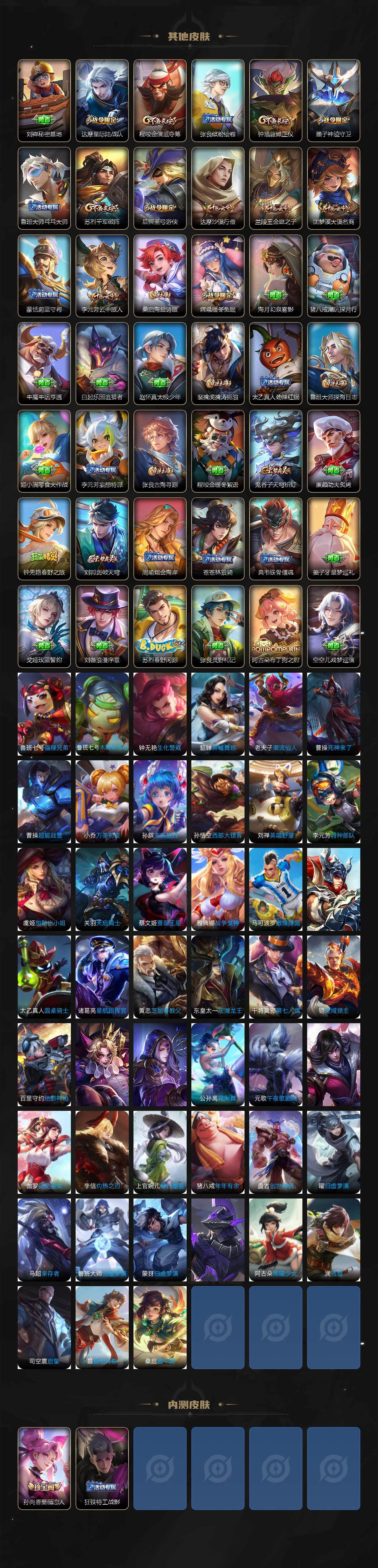 大乔猫狗日记,孙策猫狗日记,诸葛亮黄金分割率,雅典娜冰冠公主,橘右京修罗,嬴政摇滚巨星,安琪拉心灵骇客,程咬金功夫厨神,刘邦德古拉伯爵,曹操幽灵船长,宫本武藏鬼剑武藏,司马懿暗渊魔法,廉颇地狱岩魂,夏侯惇乘风破浪,花木兰水晶猎龙者,铠曙光守护者,百里玄策热力回旋,墨子金属风暴,百里玄策原初追逐者,吕布圣诞狂欢,百里守约特工魅影,雅典娜黎明之约,澜赏金猎手,貂蝉唤灵魅影,百里守约真我赫兹,李元芳匿光侦查者