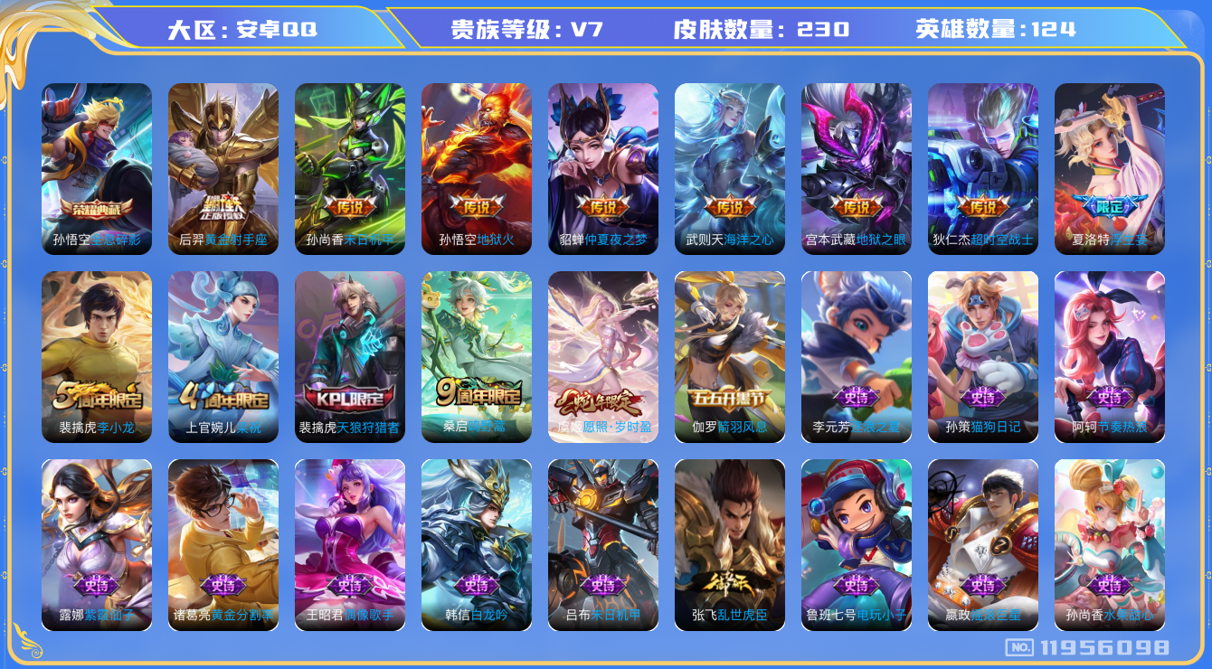 - [11686607]V8 1典藏 15传说 122英雄 219皮肤 可修改实名 优质装备:全息碎影(猴子典藏),黄金狮子座,黄金射手座,冠军飞将,绛天战甲(鸡嘴战神),久胜战神,云霓雀翎,末日机甲-孙尚香(绿蚂蚱),地狱火,零号·赤焰,地狱之眼 传说皮:典韦战鼓燎原 珍宝阁皮:优雅恋人 限定皮:逐霄战戟,凤求凰(白切鸡),时雨天司(水龙头),瑞麟志(木兰年限),遇见飞天,五谷丰年,青龙志(铠年限),冰锋战神,天狼运算者,游园惊梦,梁祝,御风骁将(吕布年限),逐梦之星,天狼征服者,奔雷神使(牛魔年限),祈雪灵祝(雪兔子),李小龙,玄武志(苏烈年限),朱雀志(守约年限),霸王别姬-虞姬,猪悟能,大圣娶亲,引擎之心,冰霜恋舞曲 史诗皮:星界特工,电玩小子(小书包),白龙吟,黄金分割率,特工魅影,千年之狐,永昼,魅语,百解令(蒙犽),无限星赏官,冰冠公主,偶像歌手,末日机甲-吕布,时之恋人-孙尚香,乱世虎臣,节奏热浪,女仆咖啡,摇滚巨星,星夜王子,心灵骇客,德古拉伯爵,暗隐猎兽者,鬼剑武藏,舞动绿茵,地狱岩魂,纤云弄巧,拒霜思,缤纷独角兽,乘风破浪,逐浪之夏,水晶猎龙者,唤灵魅影,金属风暴,原初追逐者,圣诞狂欢,圣诞恋歌,鹰眼统帅,魅力维加斯,赏金猎手,天秀·音浪,无心,未来纪元-赵云