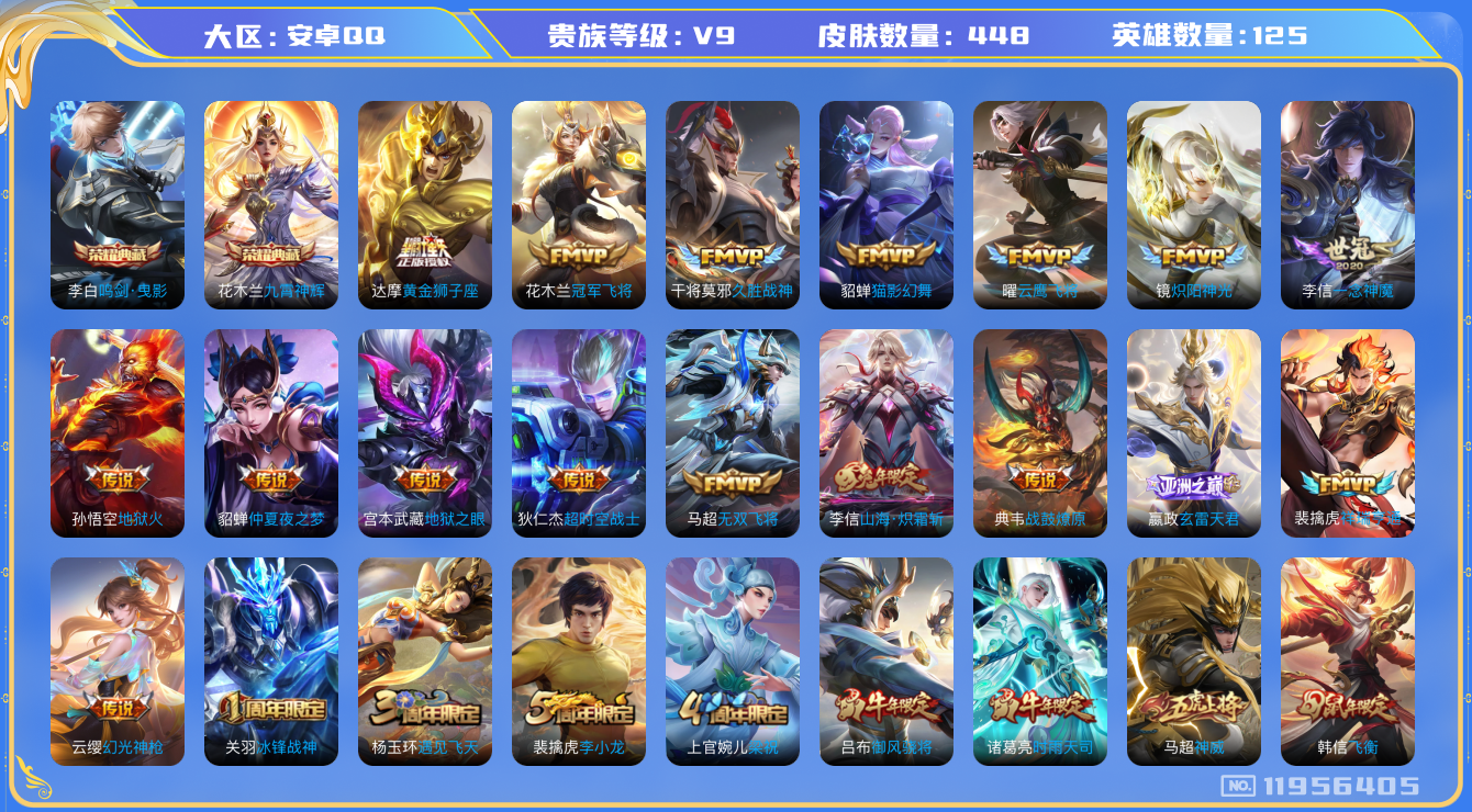[11956405]【商品标题】:安卓Q-V9-最强王者段位-125英雄-448皮肤-2典藏-0珍品无双-0无双-0珍品传说-28传说-136史诗