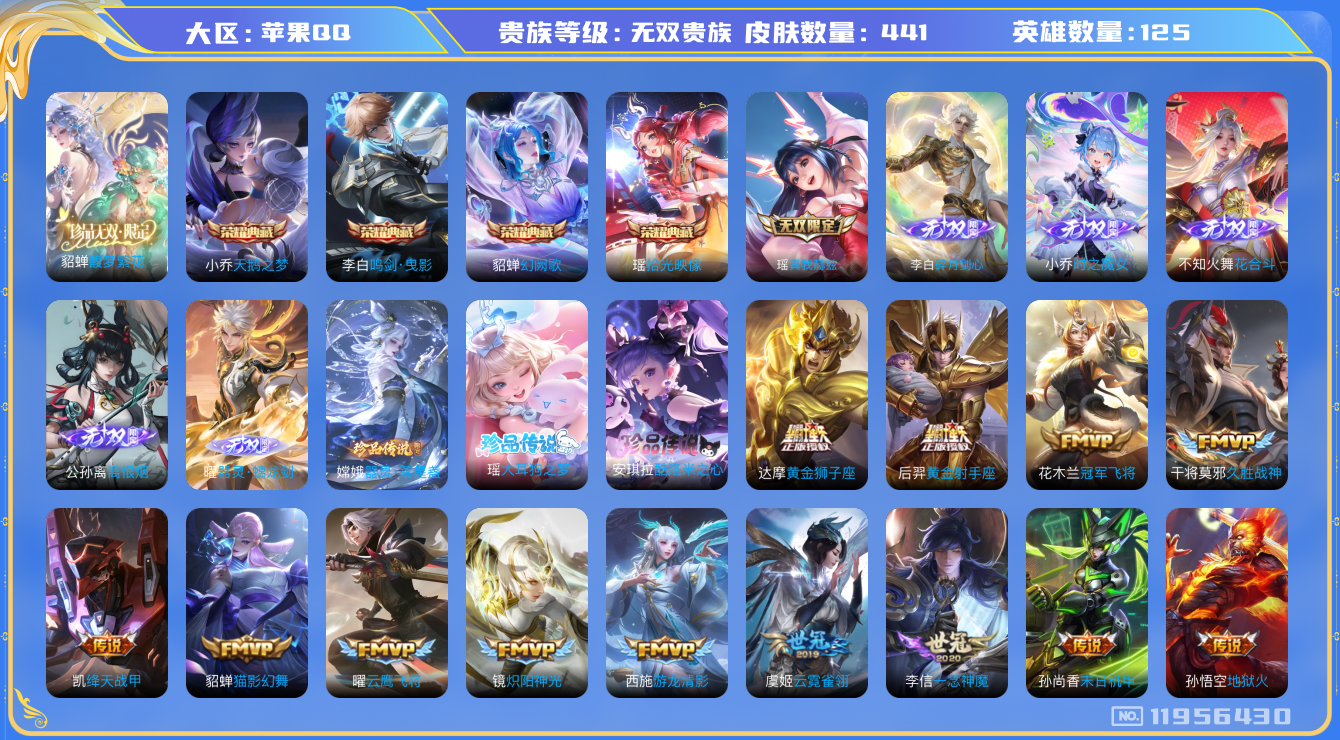 [11956430]【商品标题】:苹果Q-V11-最强王者段位-125英雄-441皮肤-4典藏-1珍品无双-6无双-3珍品传说-67传说-116史诗